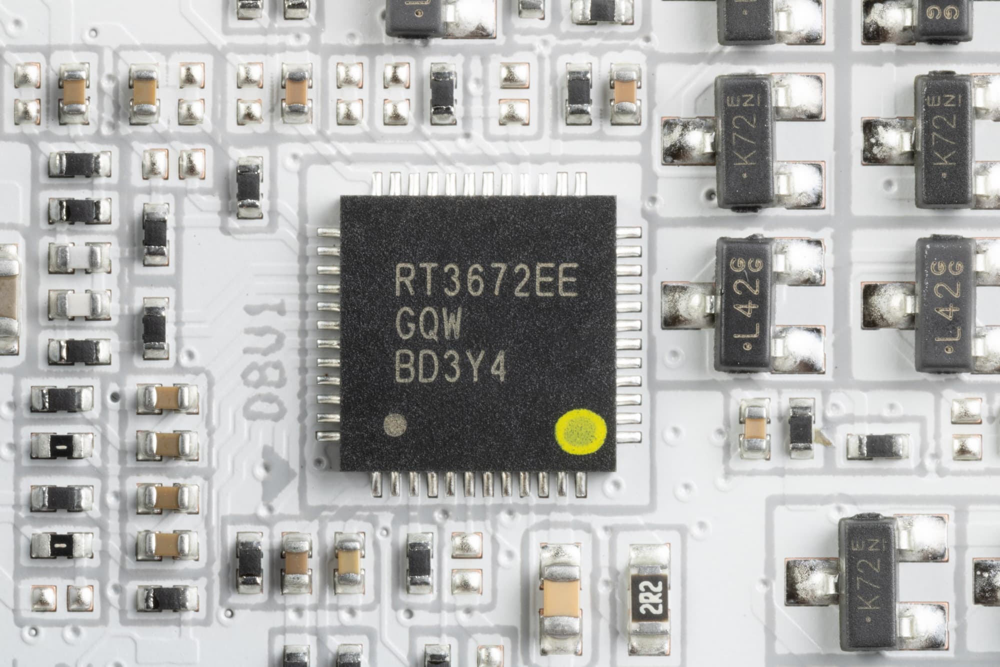 Управляет этой схемой ШИМ-контроллер RT3672 от Richtek.