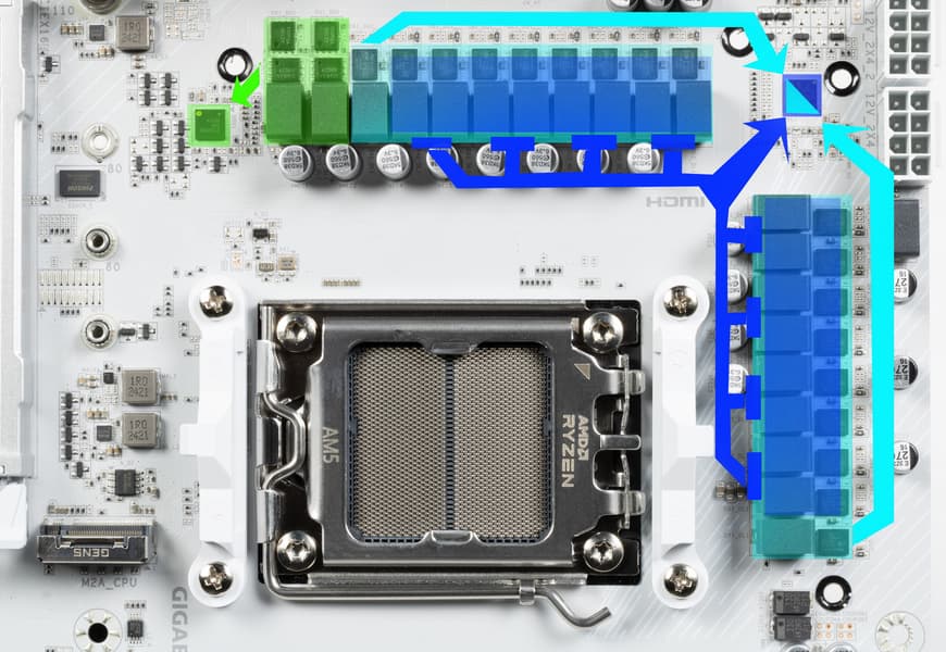 Внешне схема питания выглядит как 16+2+2: 16 фаз — ядро процессора, 2 фазы — SoC (I/O-чиплет Ryzen), 2 фазы — VDD_MISC (вывод встроенной графики).
