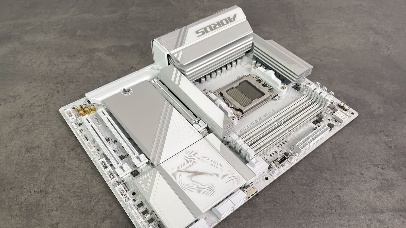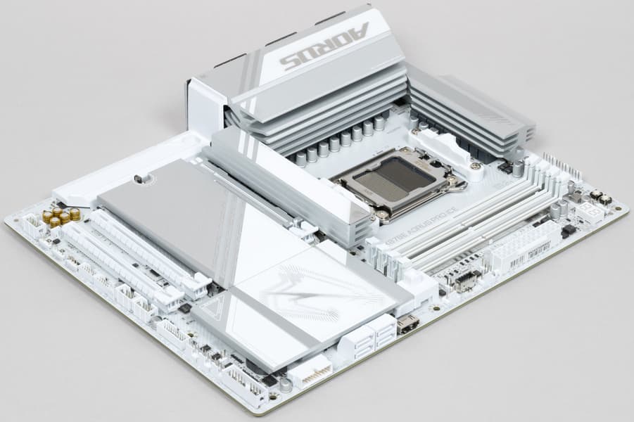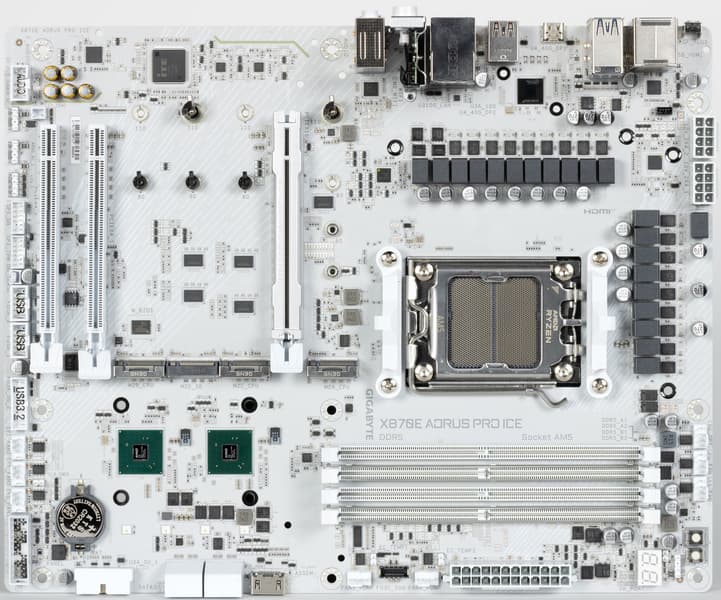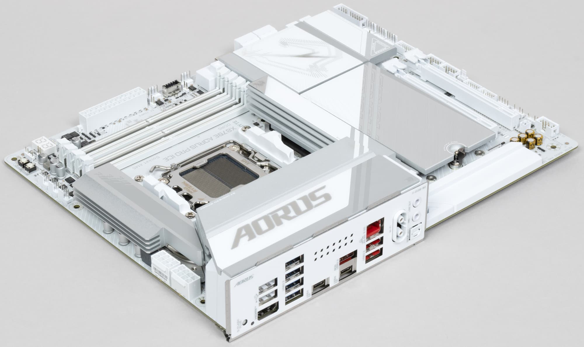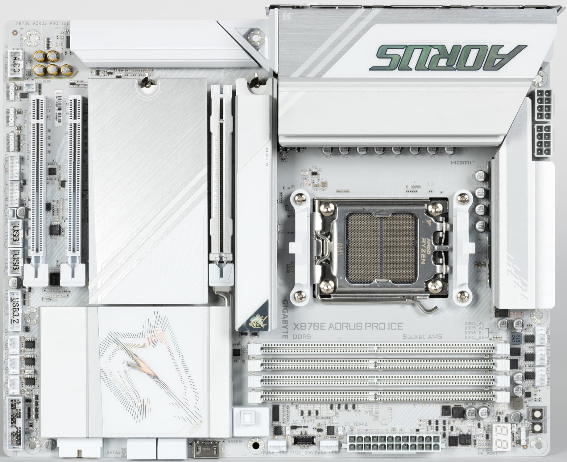 Переходим к самой материнской плате Gigabyte X870E Aorus Pro Ice. Уже по суффиксу Ice в названии можно понять, что плата белого цвета (ну или в серо-белых тонах).