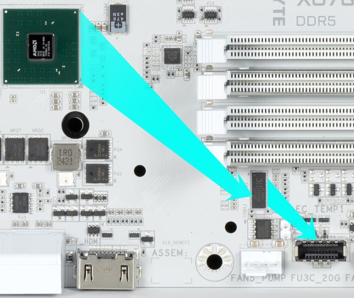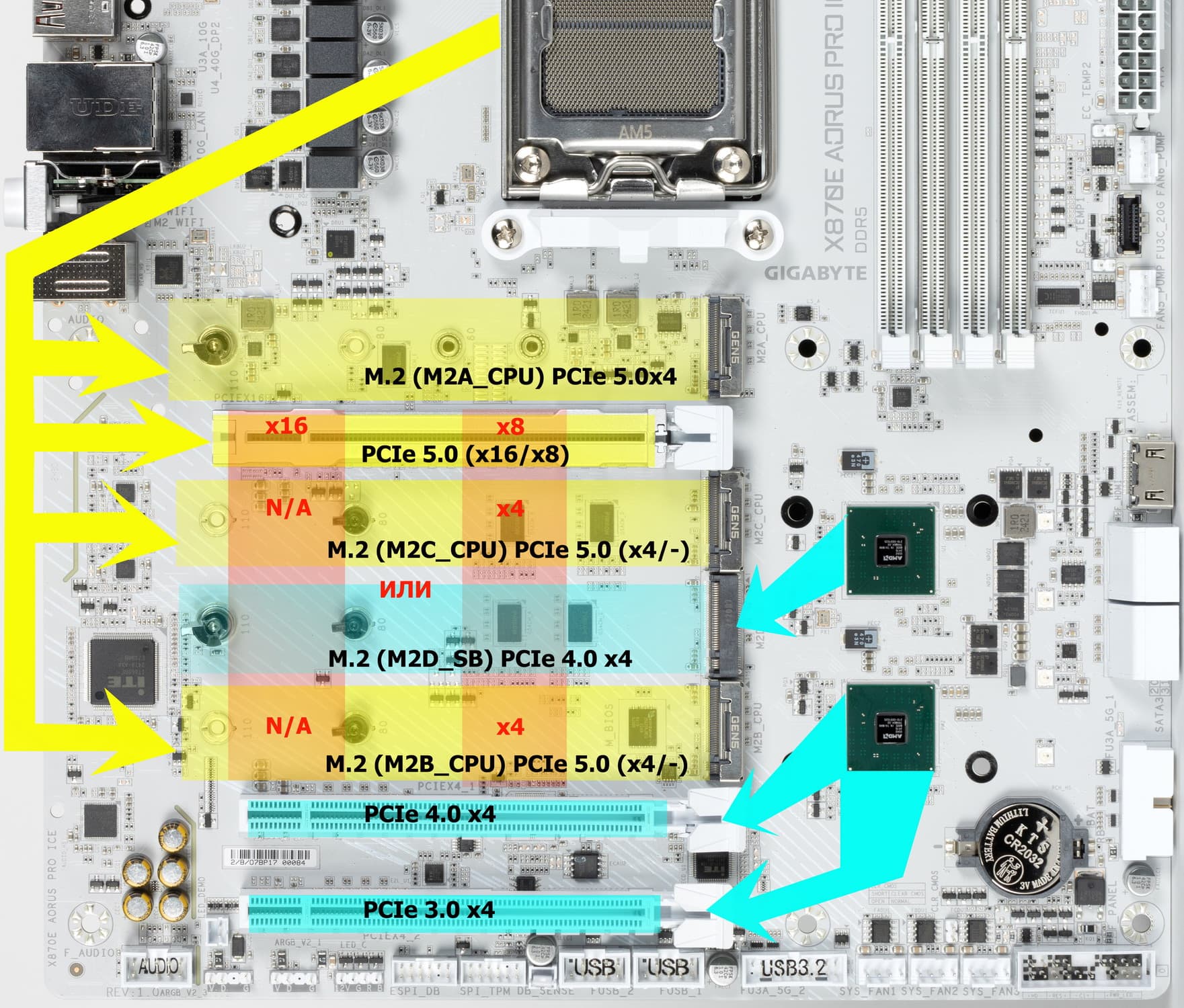 Итак, кроме USB-портов, к которым мы подойдем позже, чипсет X870E обладает 20 PCIe линиями (плюс 4 линии на аплинк с процессором). Считаем, сколько линий уходит на поддержку (связь) с тем или иным элементом: