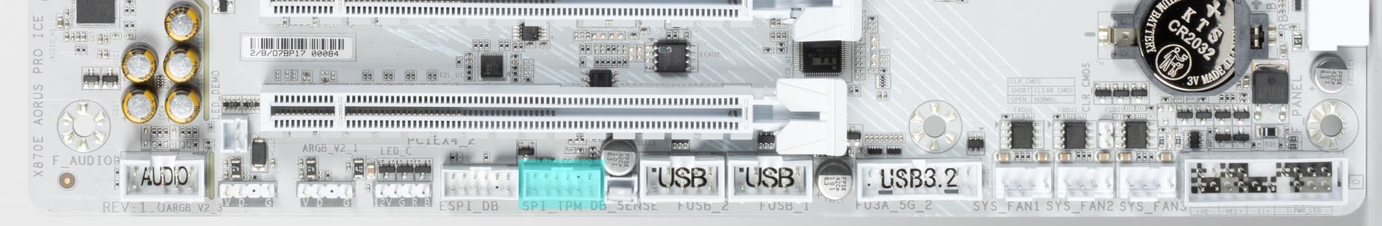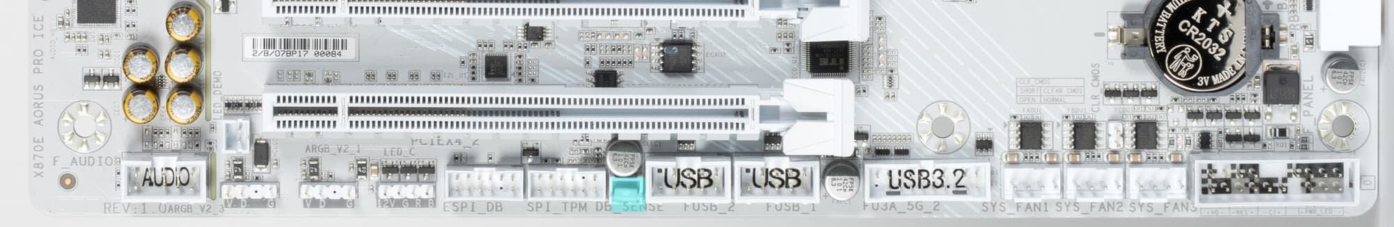 - 6 портов USB 2.0/1.1: все реализованы через X870E и 4 представлены двумя внутренними разъемами (каждый на 2 порта), еще 2 представлены портами Type-A (белого цвета) на задней панели.