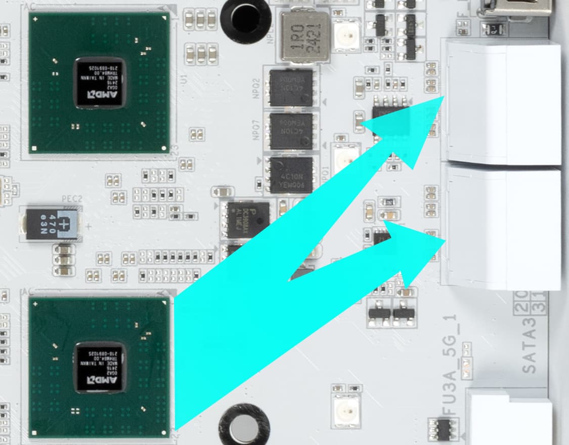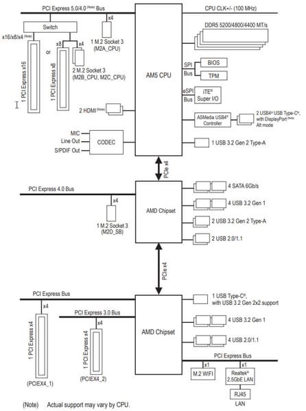Отметим, что серия 8хх отличается от 6хх прежде всего обязательным присутствием контроллера USB4, что ранее было опциональным и зависело от желания партнера AMD. На сегодня такой контроллер это ASM4242 от ASMedia, и он требует 4 линии PCIe, которые могут использоваться как от чипсета 8xx, так и от процессора Ryzen (за счет линий для NVMe (M.2) слотов).
