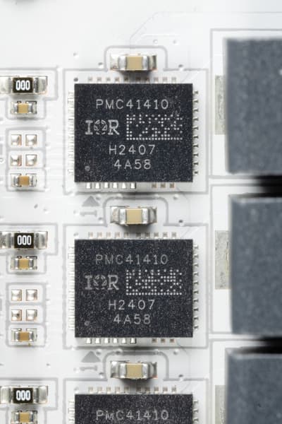 Каждый канал фазы VCore и встроенной графики имеет суперферритовый дроссель и транзисторную сборку PMC41410 от Infineon (ex- IOR) (до 105A).