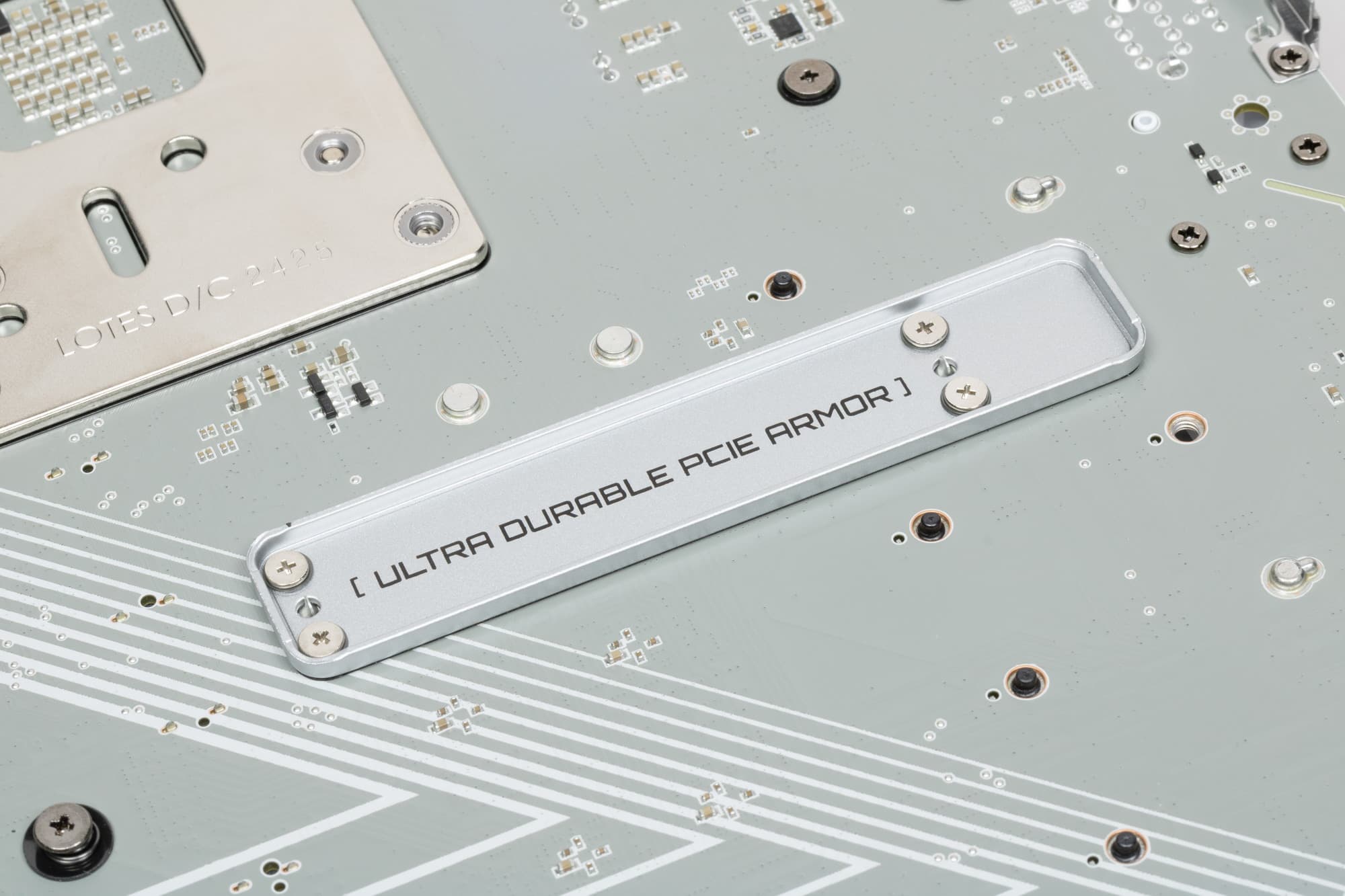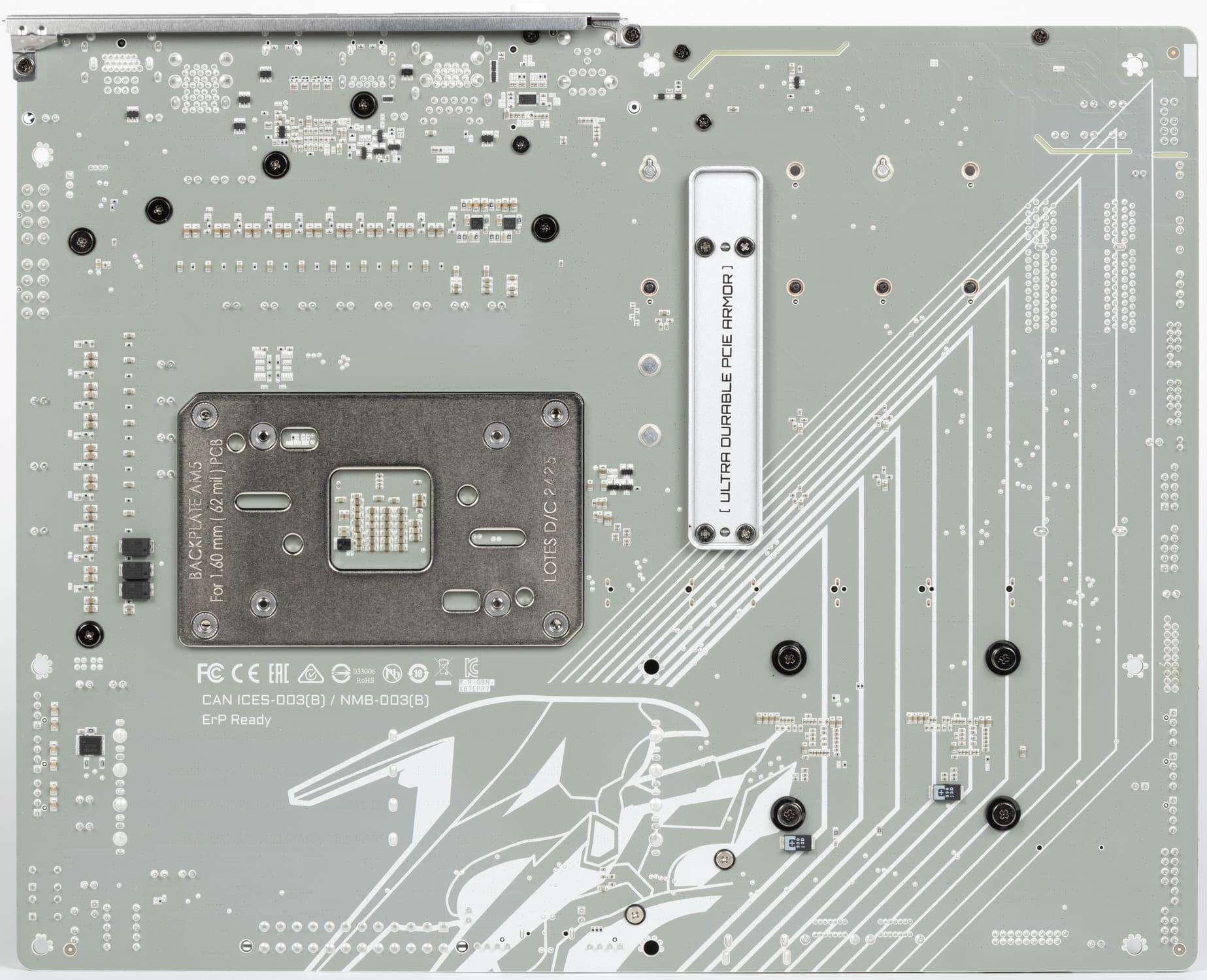 Кстати, вот одно из традиционных отличий продуктов топового уровня от остальных: оснащение слота для видеокарты PCIe x16 очень внушительной пластиной жесткости с оборотной стороны PCB.