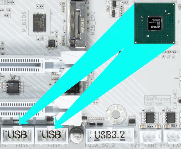 Все быстрые USB 3.2 порты оснащены ре-драйверами.