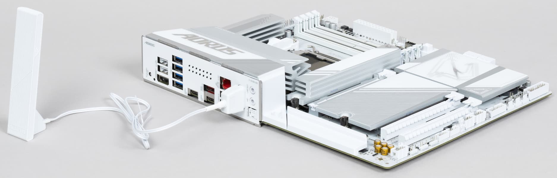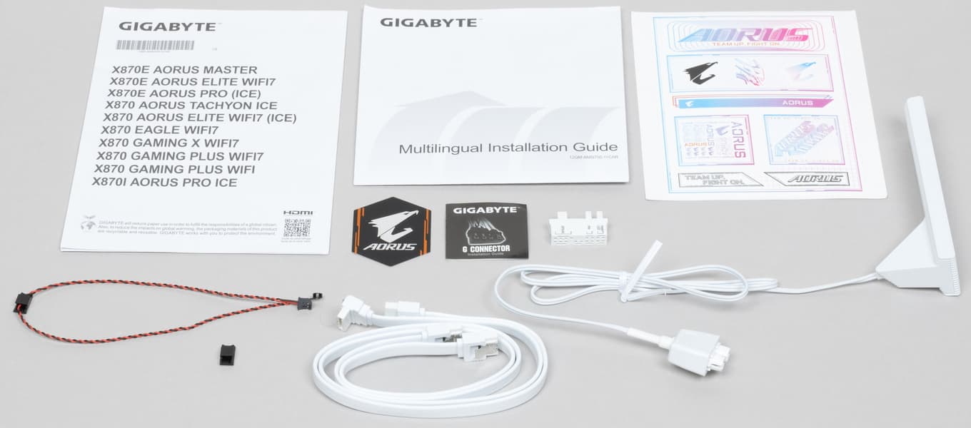 Комплект поставки скромен, ибо, как я уже говорил ранее, внутри серии Aorus имеются продукты разных уровней (например, Aorus Xtreme, Aorus Master – это флагманы, Aorus Pro – уровнем ниже, Aorus Elite – еще ниже), и наша материнка относится к как бы к среднему уровню топовой серии. Итак, кроме традиционных элементов типа руководства пользователя и кабелей SATA (кстати, тоже белые), имеются антенна встроенного Wi-Fi-модуля (белая!), провод с детектором шума, фирменный адаптер G-connector для передней панели, бонусные стикеры.