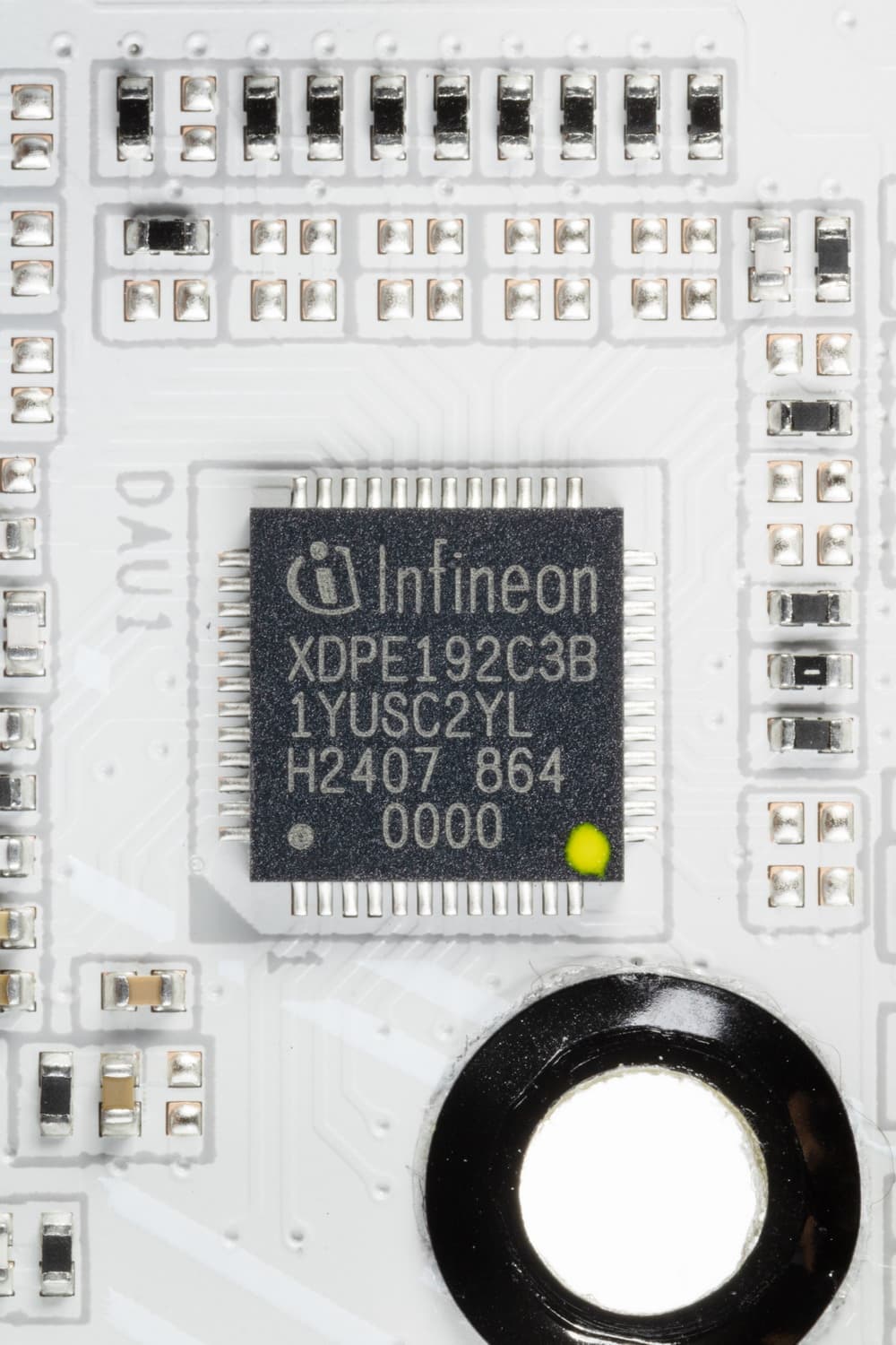 Управляет обоими наборами фаз (16+2) ШИМ-контроллер XDPE192C3B от Infineon, рассчитанный на 12 фаз, поэтому у фаз питания для VCore организовано параллельное управление: 8x2 плюс 2 фазы на встроенную графику: физически 10 фаз питания.