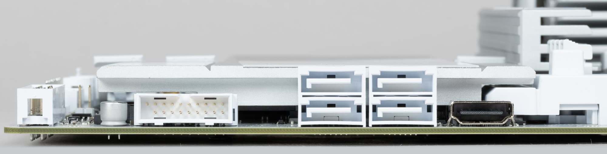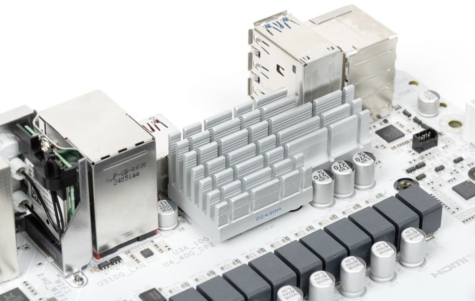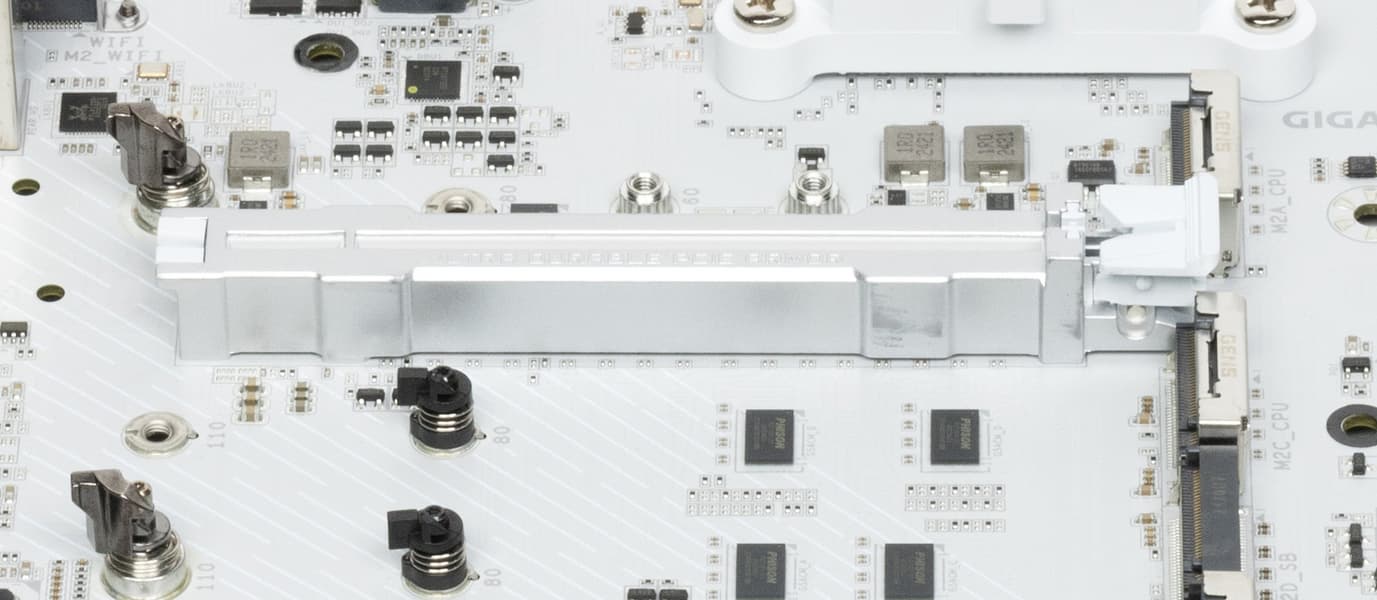 Все M.2 слоты на матплате имеют радиаторы. Слот M2A_CPU обладает отдельным очень толстым радиатором, когда как остальные M.2 слоты имеют общий радиатор. Следует отметить, что слот M2A_CPU кроме охлаждения верхней стороны имеет еще и нижний радиатор.