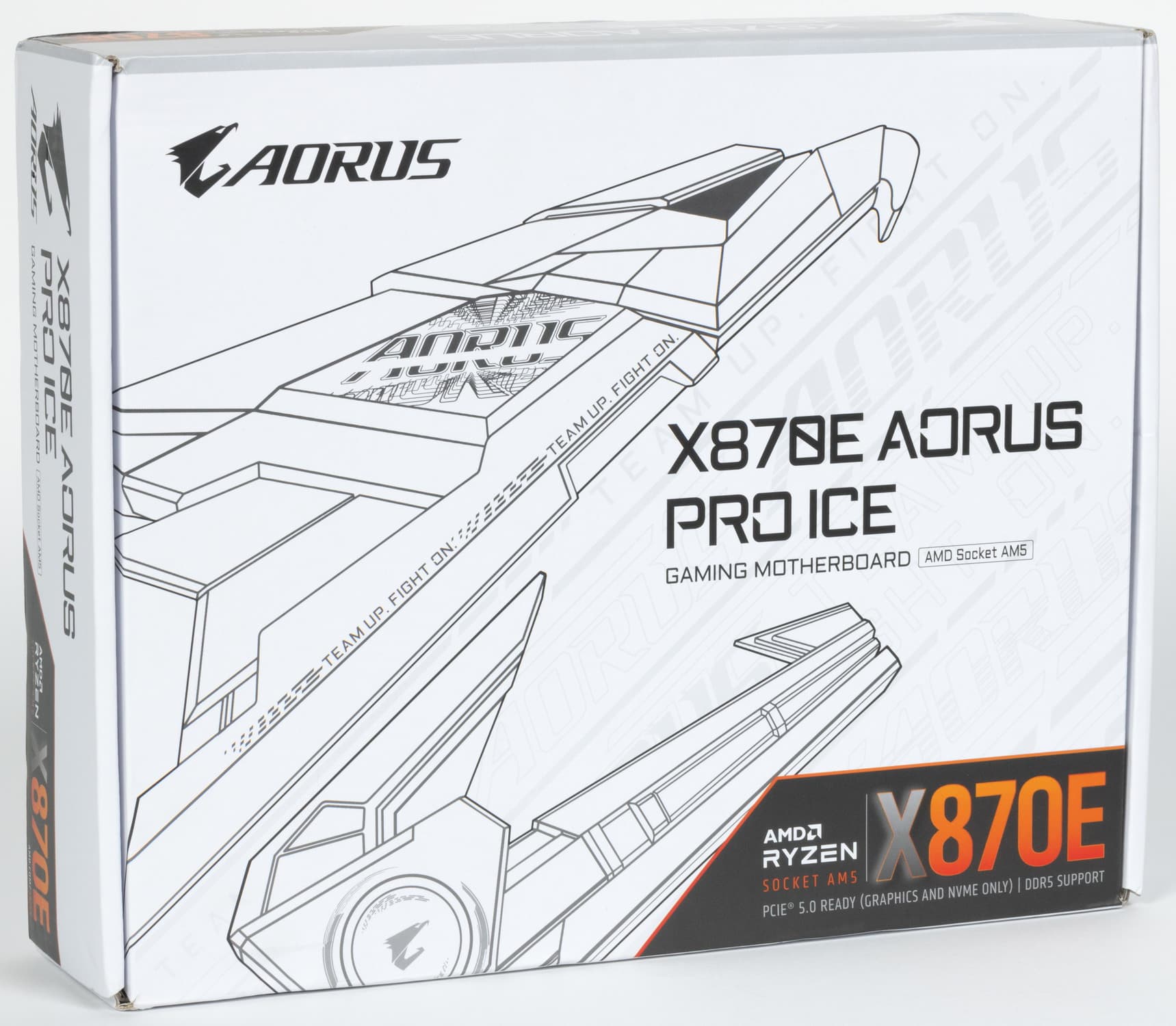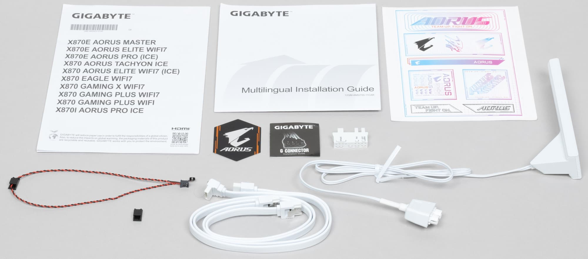 Gigabyte X870E Aorus Pro Ice поставляется в традиционной коробке фирменного дизайна серии (но белого цвета, подчеркивающего окрас самой материнки). Комплект размещен под платой в отдельном отсеке.