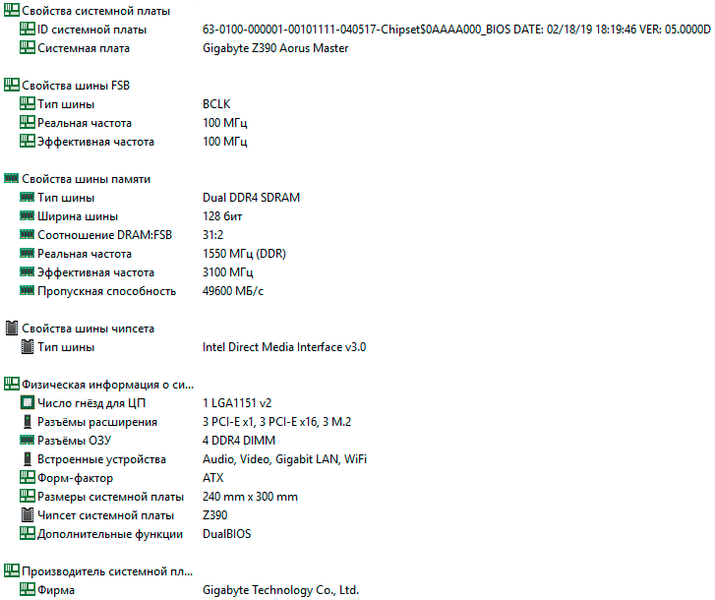 Перед тестированием напомним вам характеристики материнской платы Gigabyte Z390 Aorus Master с помощью утилиты AIDA64 Extreme.
