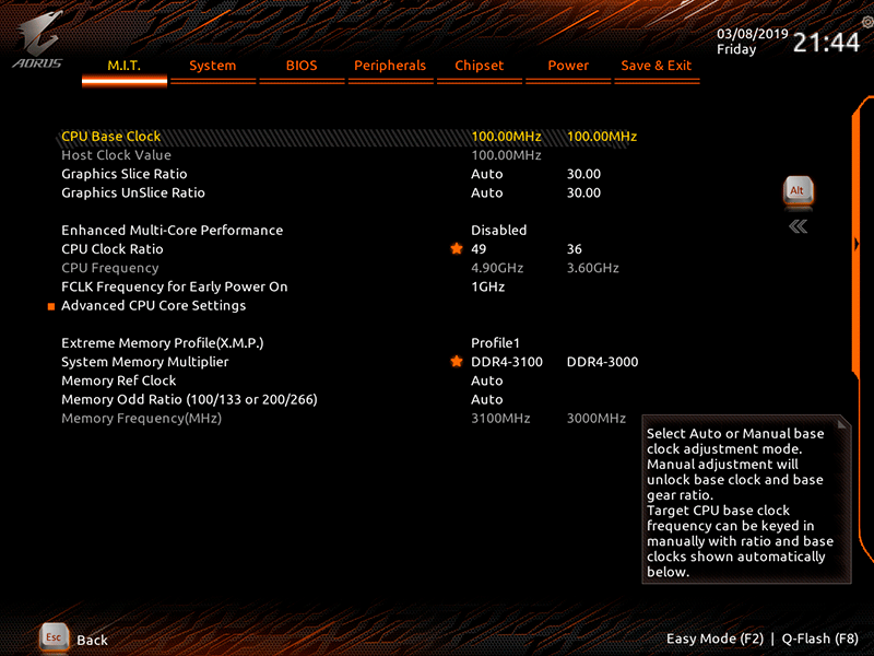 В первом подразделе для изменения доступны основные параметры платы, процессора и памяти. Мы предлагаем сразу жестко зафиксировать BCLK на 100 МГц и отключить автоматическую оптимизацию частоты ядер процессора Multi-Core Performance. Далее здесь же выставляем множитель процессора и активируем XMP оперативной памяти.
