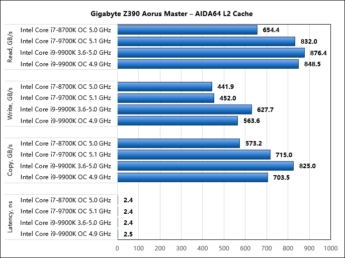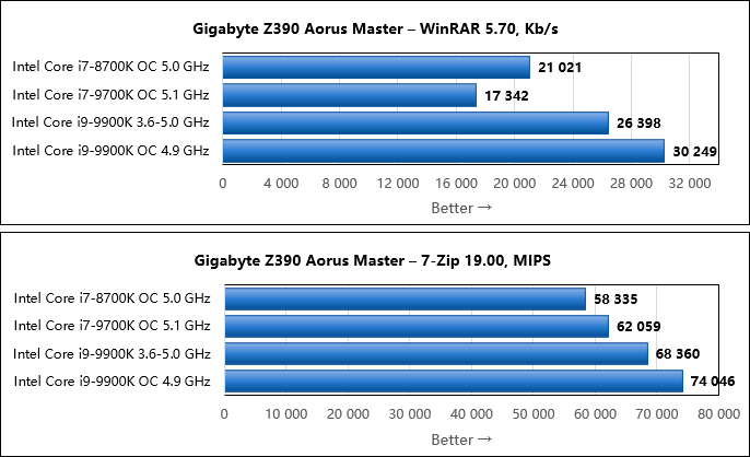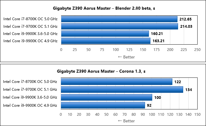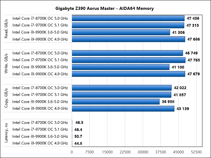 На диаграммах с результатами тестирования производительности кроме трех разогнанных процессоров мы приведем результаты тестов платформы с Intel Core i9-9900K, но в номинальном режиме работы и с памятью на 3,0 ГГц с XMP. Во всех остальных случаях память функционировала на частоте 3,1 ГГц с дополнительно настроенными таймингами (как на скриншоте выше), для AVX был задан оффсет 3, а частота Uncore была равна 4,7 ГГц.