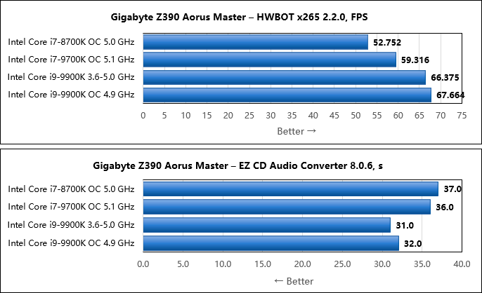 Недавно мы опубликовали обзор материнской платы Gigabyte Z390 Aorus Master на чипсете Intel Z390. Это модель дорогая, продвинутая, она оснащена усиленной 12-фазной системой питания процессора и создана специально для разгона и достижения частот 5 ГГц и выше, о чем с уверенностью заявляет сама Gigabyte. В первой статье вопрос разгона процессоров остался не раскрыт, и чтобы устранить этот пробел, мы проверили разгон сразу трех процессоров Intel Core на этой материнской плате.