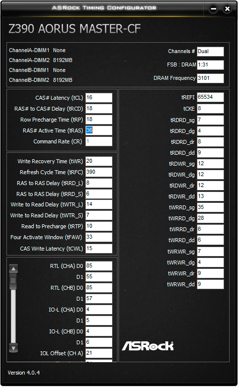 После завершения всех тестов процессоров мы слегка настроили оперативную память на плате Gigabyte Z390 Aorus Master в целях повышения ее производительности. Поскольку выдающимся оверклокерским потенциалом наш двухканальный комплект GeIL Super Luce RGB с номинальной частотой 3,0 ГГц похвастать не может, мы выставили его частоту на 3,1 ГГц с основными таймингами 16-18-18-36 CR1 и корректировкой отдельных вторичных таймингов. Конечный результат приведен на скриншоте ниже.
