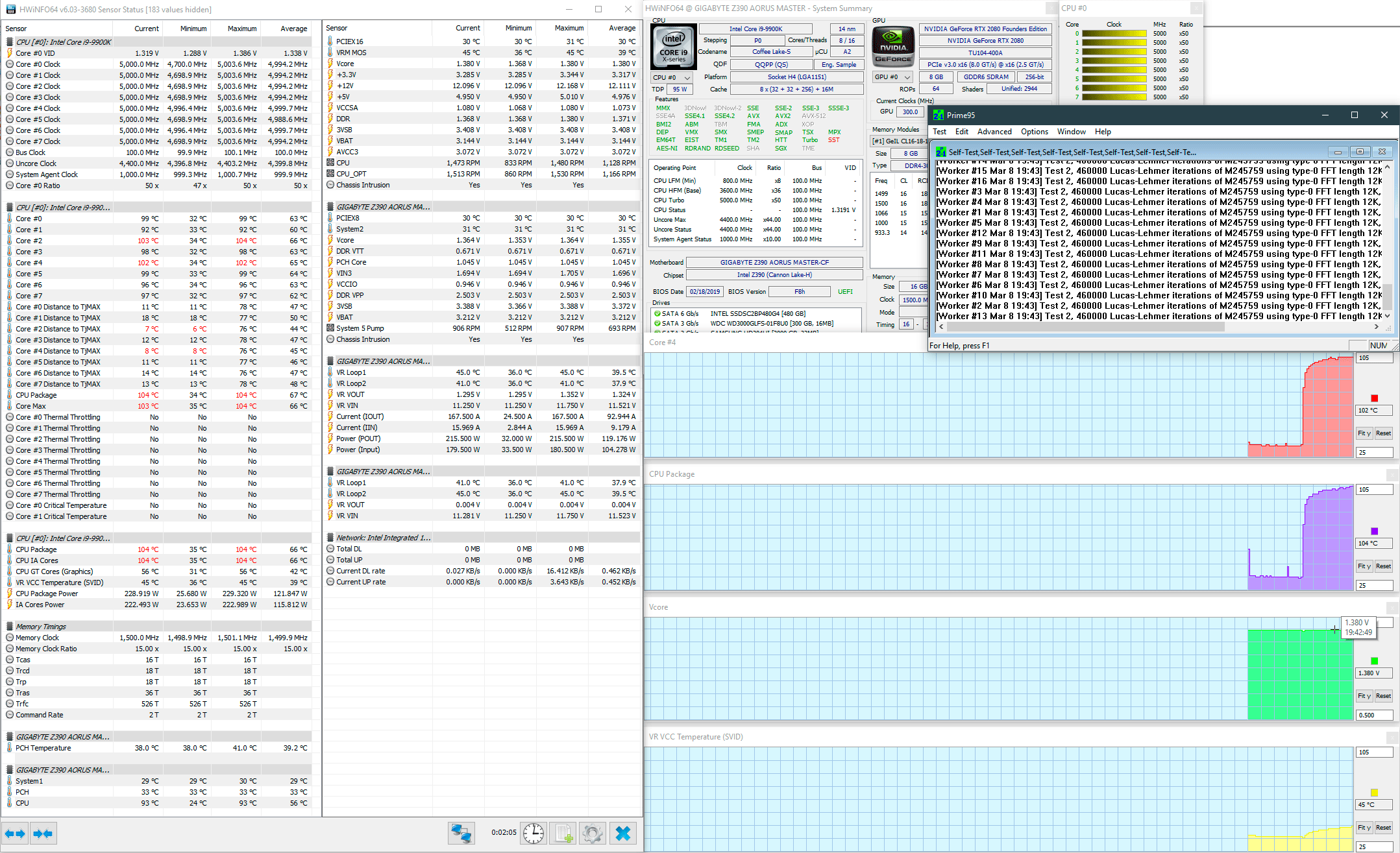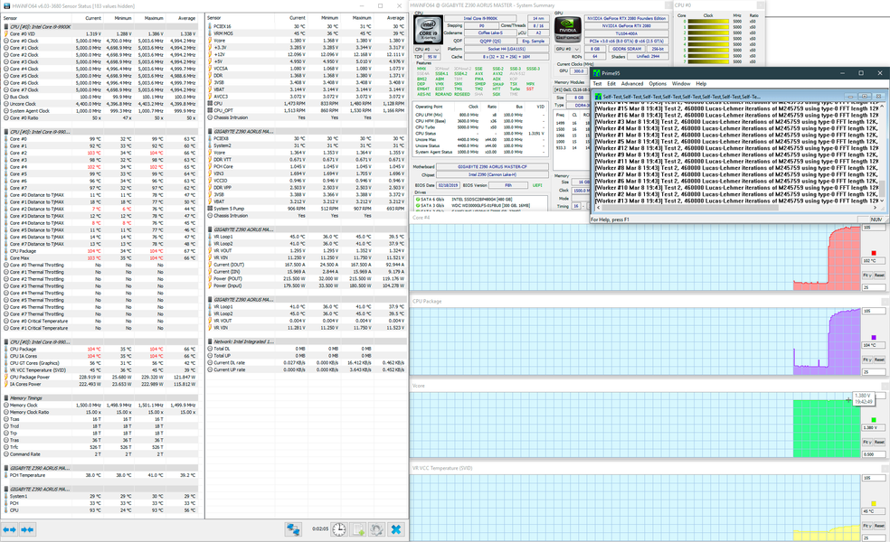Как только ядра Intel Core i9-9900K нагружались жестким алгоритмом Prime95, всего за пару минут температура процессора повышалась до 104 градусов Цельсия, и мы были вынуждены остановить тест.
