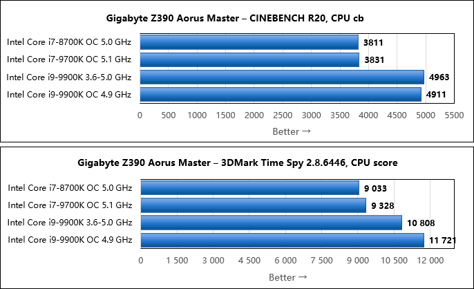 Из результатов тестирования можно сделать два вывода. Первый: разница между производительностью платформ с Intel Core i7-8700K, разогнанным до 5,0 ГГц, и с Intel Core i7-9700K на частоте 5,1 ГГц минимальна. Причем не всегда выигрывает более новая модель процессора, поскольку 6 ядер + 6 HT в отдельных приложениях работают эффективнее чистых 8 ядер. Второе: разгон Intel Core i9-9900K по всем ядрам одновременно до 4,9 ГГц в семи тестах из двенадцати ничего не дает (заметим, что на разогнанной платформе еще и память была быстрее). То есть разгон этого CPU до такой частоты — весьма спорное занятие с точки зрения конечного результата. Впрочем, это давно известный факт.