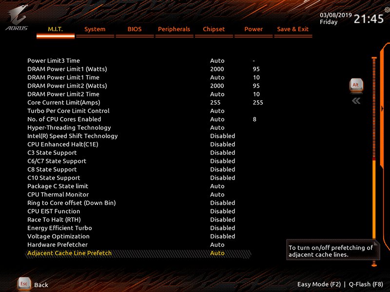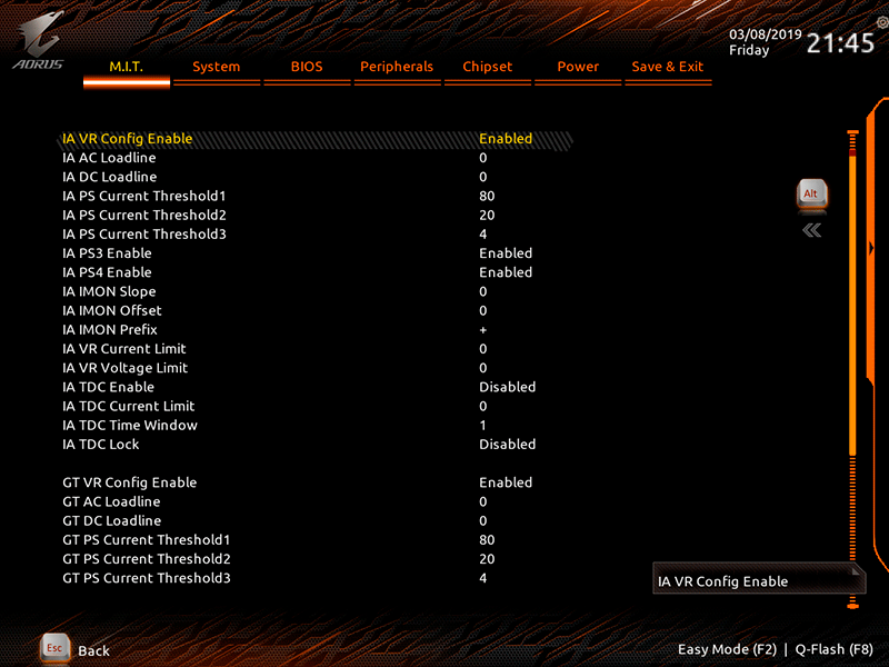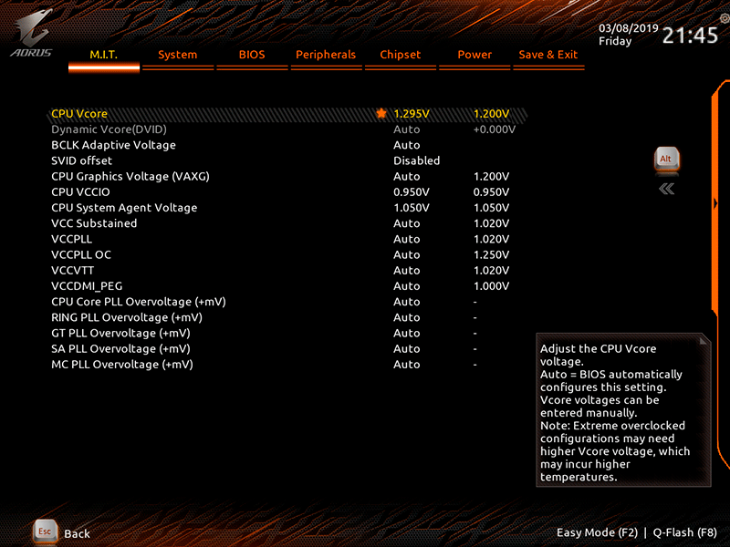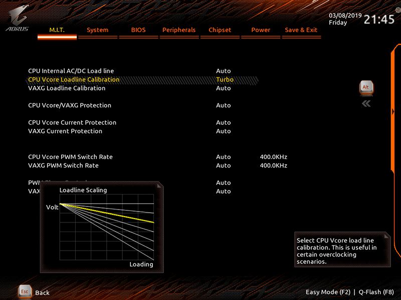 Попутно можно зафиксировать напряжения VCCIO и VCCSA, увеличение которых чаще всего требуется для разгона оперативной памяти. Также немаловажно заглянуть в раздел с режимами стабилизации напряжений, коих у Gigabyte Z390 Aorus Master в достатке. Как правило, на платах Aorus Z390 достаточно выставить CPU Loadline Calibration в значение Turbo, поскольку более жесткие алгоритмы завышают напряжение, а не стабилизируют его в заданном значении.