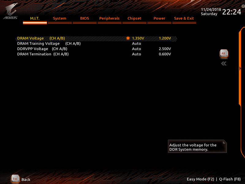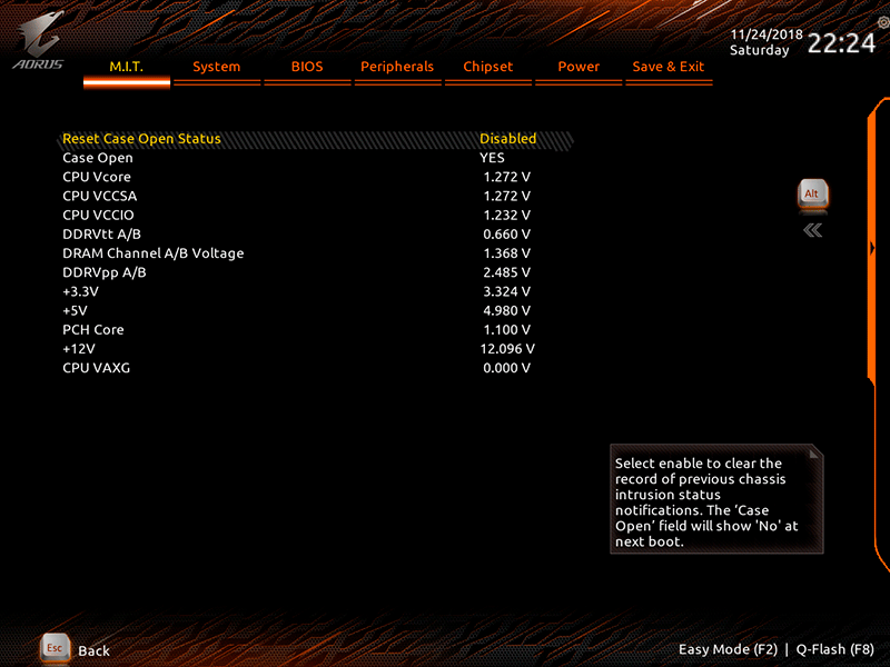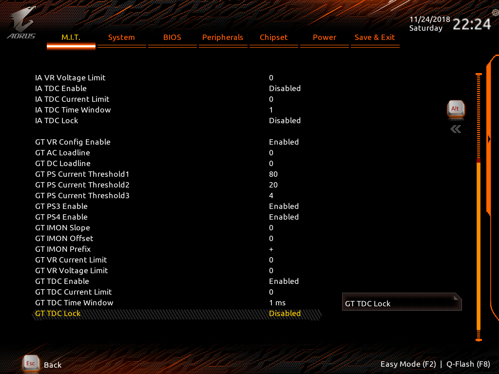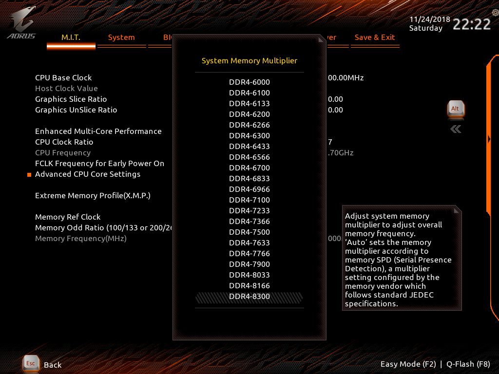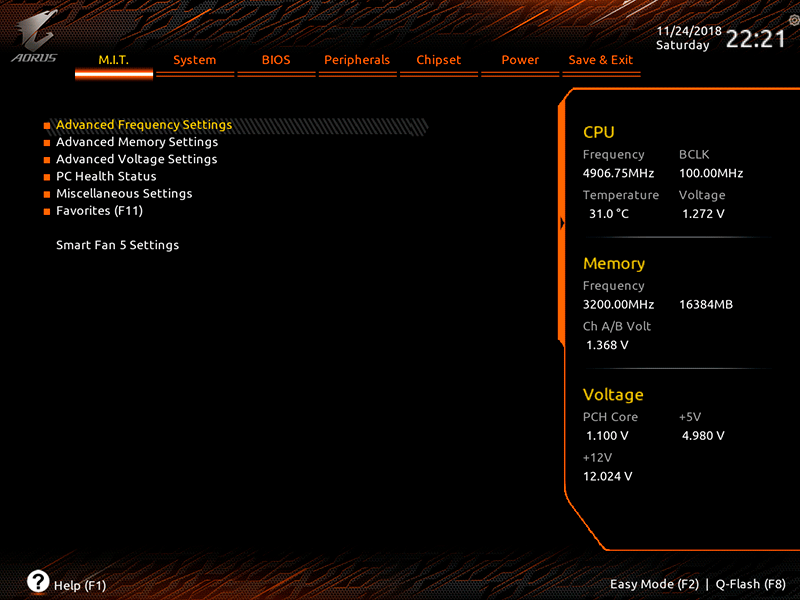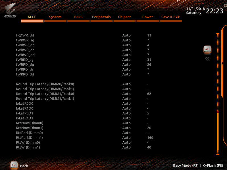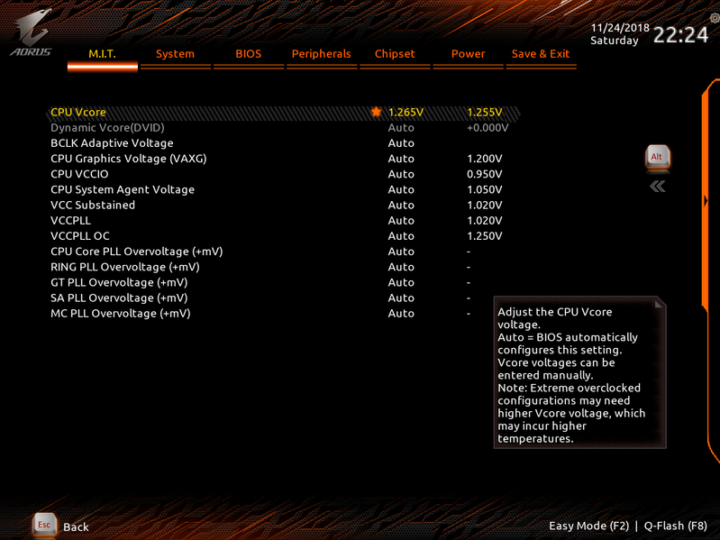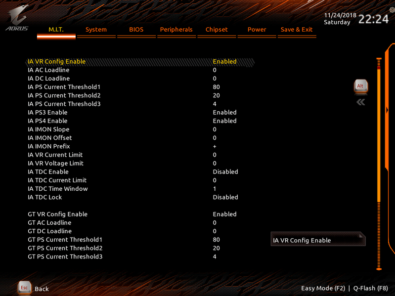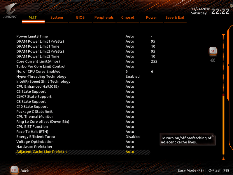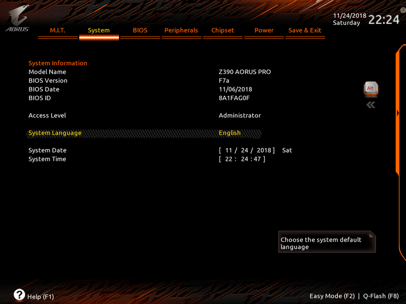 Во время тестирования нами Gigabyte Z390 Aorus Pro последний доступный BIOS F7a был в бета-статусе и датирован 7 ноября 2018 года. Он и был прошит в основную микросхему на плате. В этом разделе мы сразу же приведем скриншоты BIOS с настройками процессора и памяти, которых нам удалось достичь при разгоне в процессе тестирования и о которых мы расскажем уже в следующем разделе.