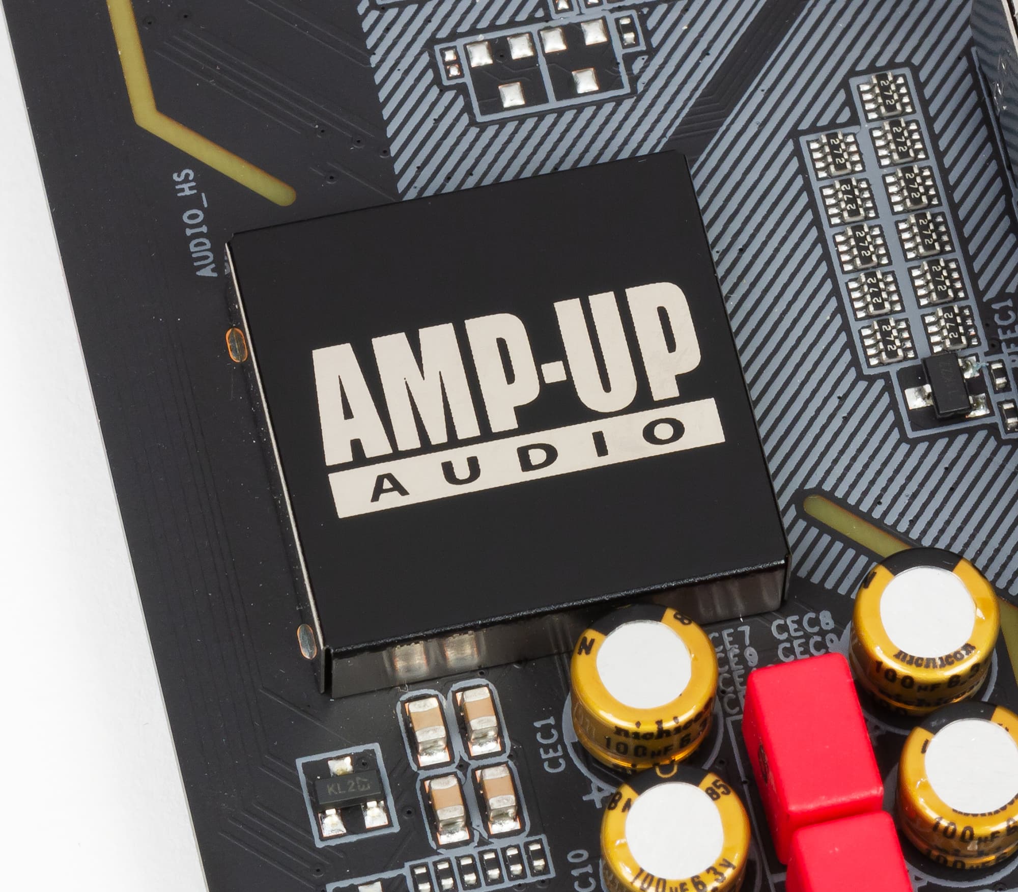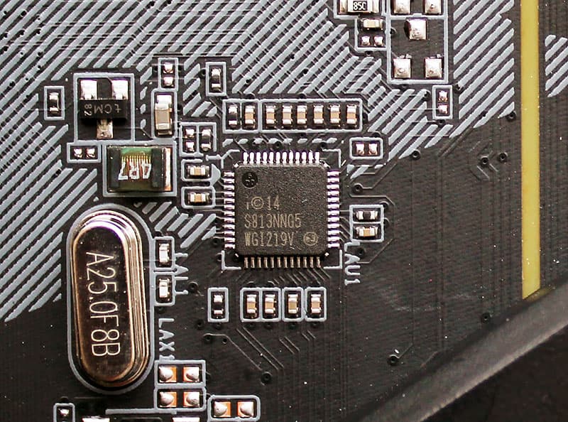 В основе звукового тракта платы лежит 7.1-канальный HDA-аудиокодек Realtek ALC1220-VB, экранированный металлическим колпачком.