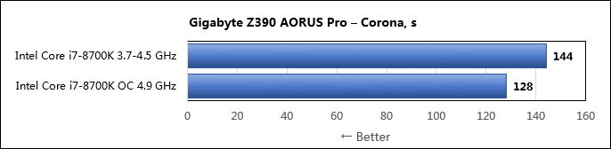 Производительность системы, собранной на Gigabyte Z390 Aorus Pro, мы проверили в двух режимах: при автоматических настройках BIOS с активированным XMP оперативной памяти, а также при разгоне процессора до 4,9 ГГц и повышении частоты памяти до 3,2 ГГц. Результаты девяти разнообразных тестов позволят оценить прирост производительности от разгона платформы, который, как оказалось, не такой уж и впечатляющий.