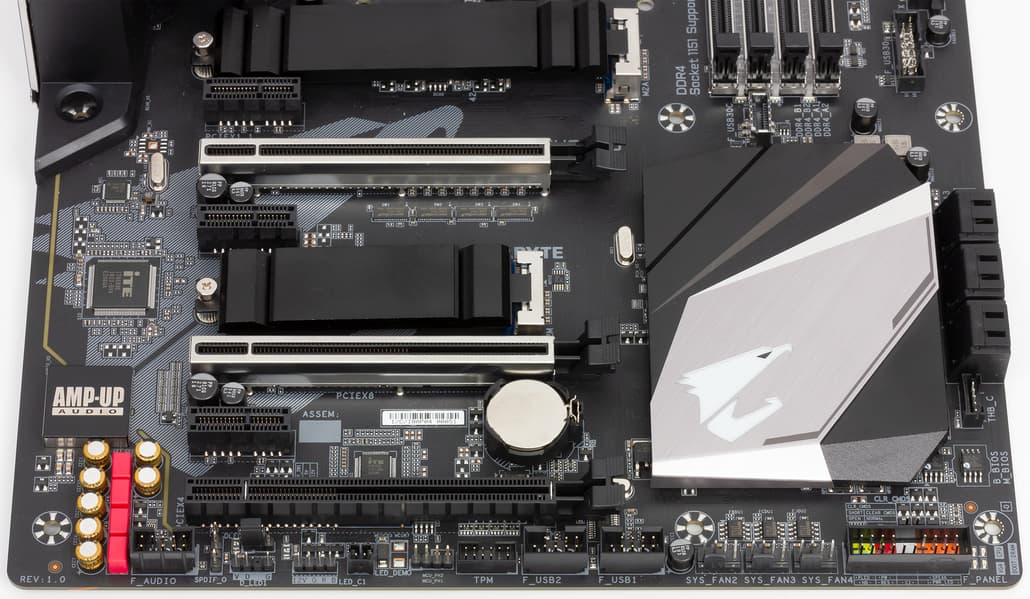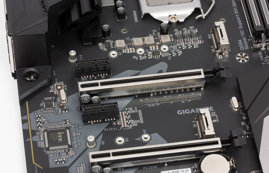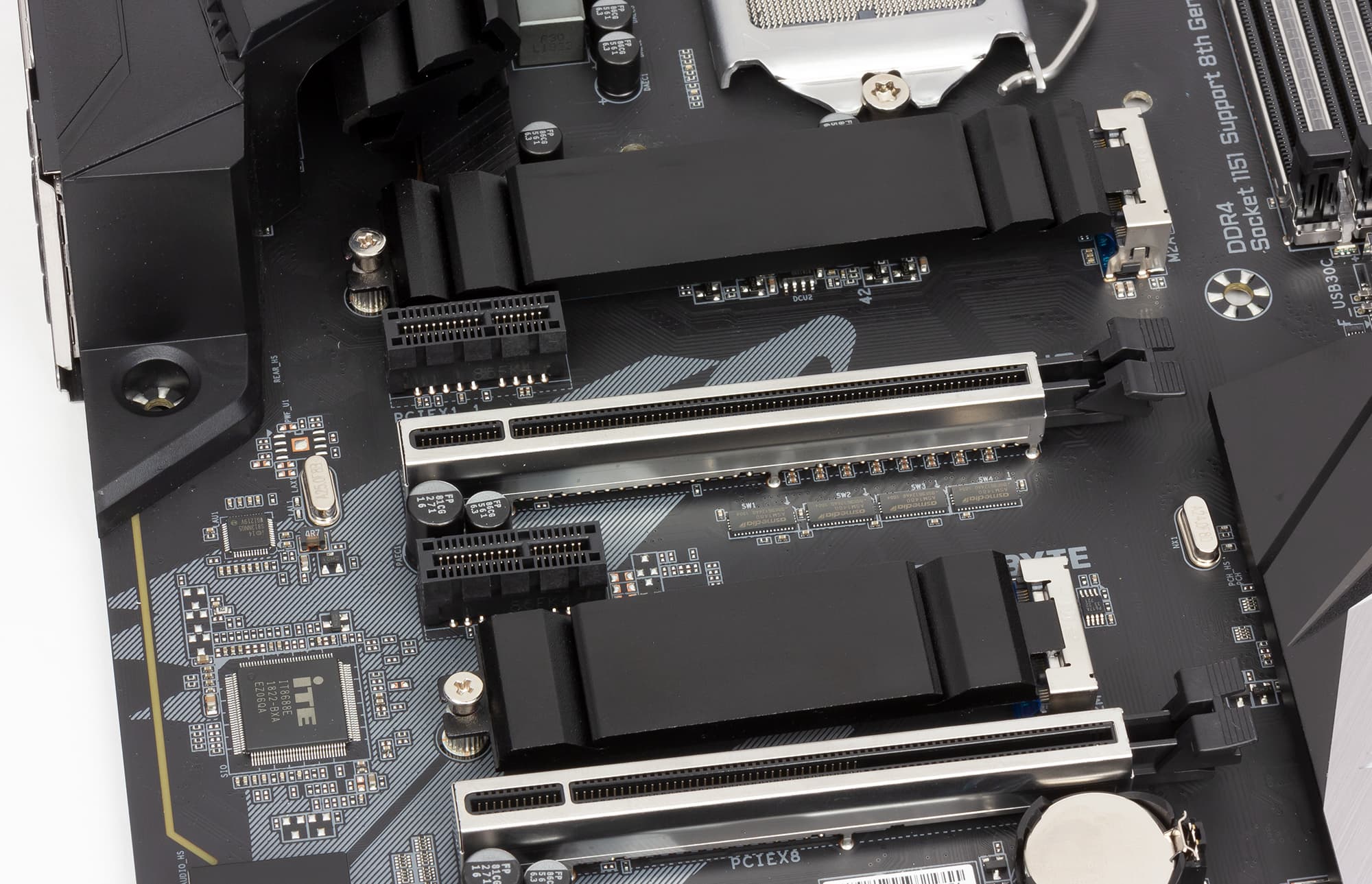 Gigabyte Z390 Aorus Pro оснащена шестью слотами PCI Express, три из которых выполнены в конструктивном исполнении x16 и два из них имеют дополнительную металлическую оболочку, усиливающую слоты на излом в 1,7 раза и в 3,2 раза на выдергивание.