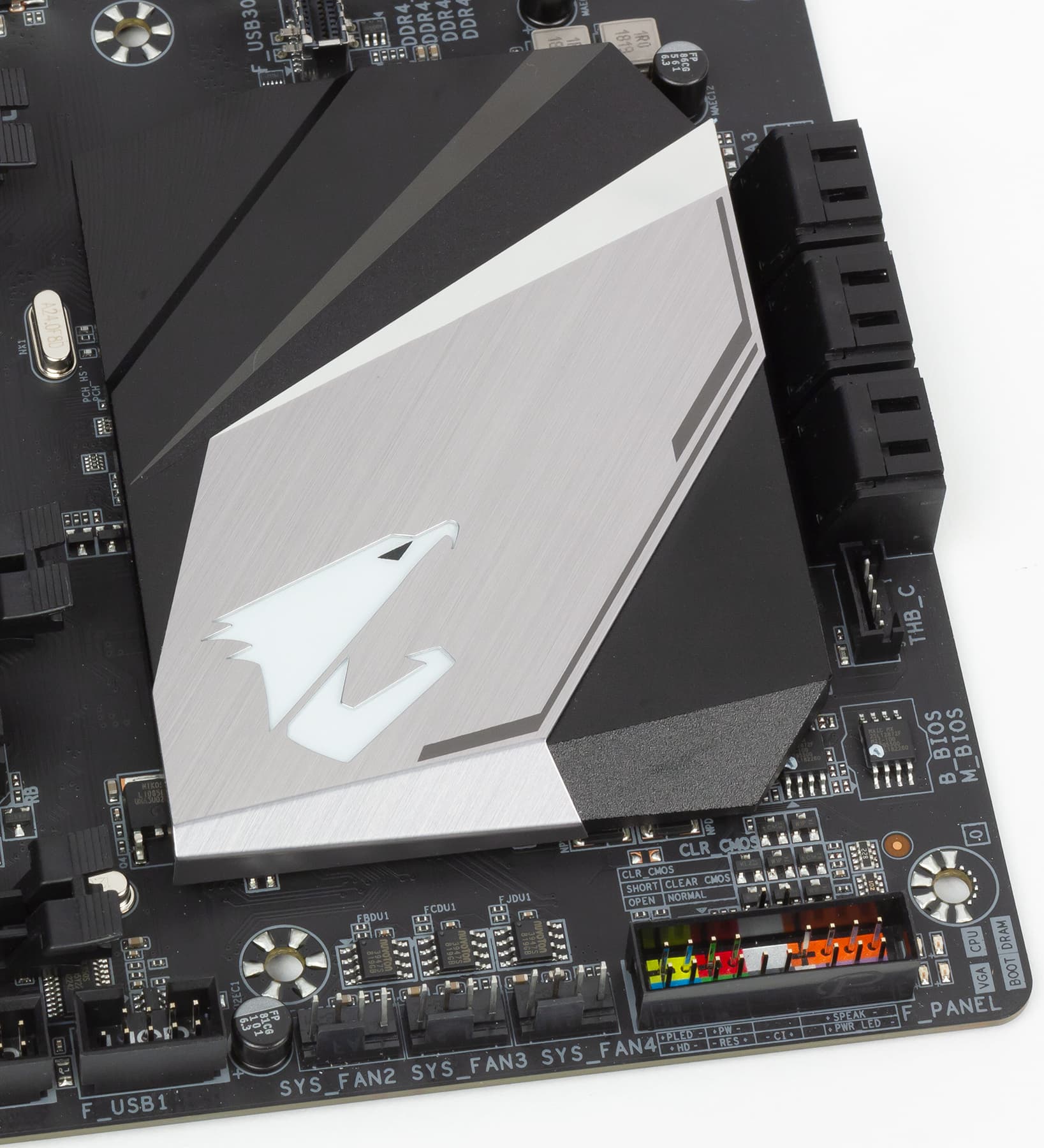 На самой плате подсвечивается зона радиатора чипсета, логотип Aorus на кожухе радиаторов VRM, две полоски экранирования зоны аудио, а также слоты оперативной памяти.