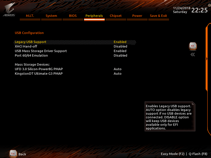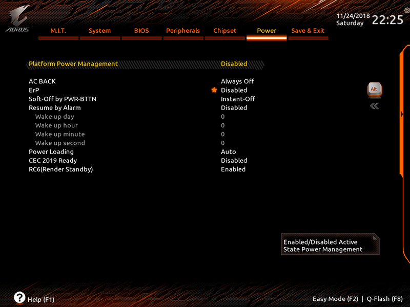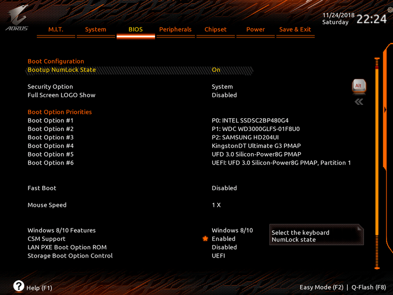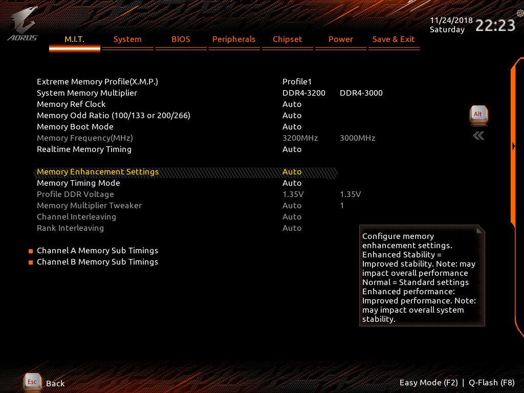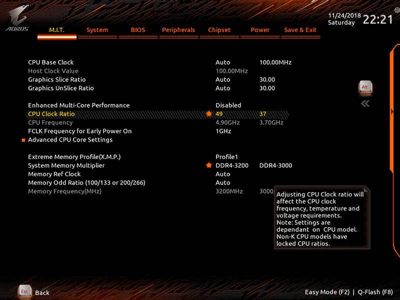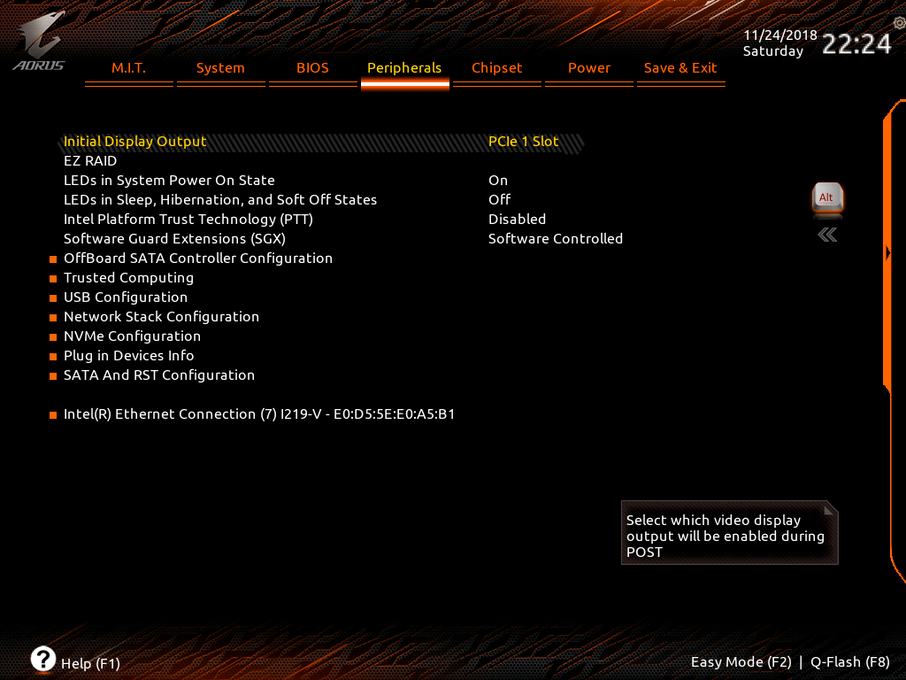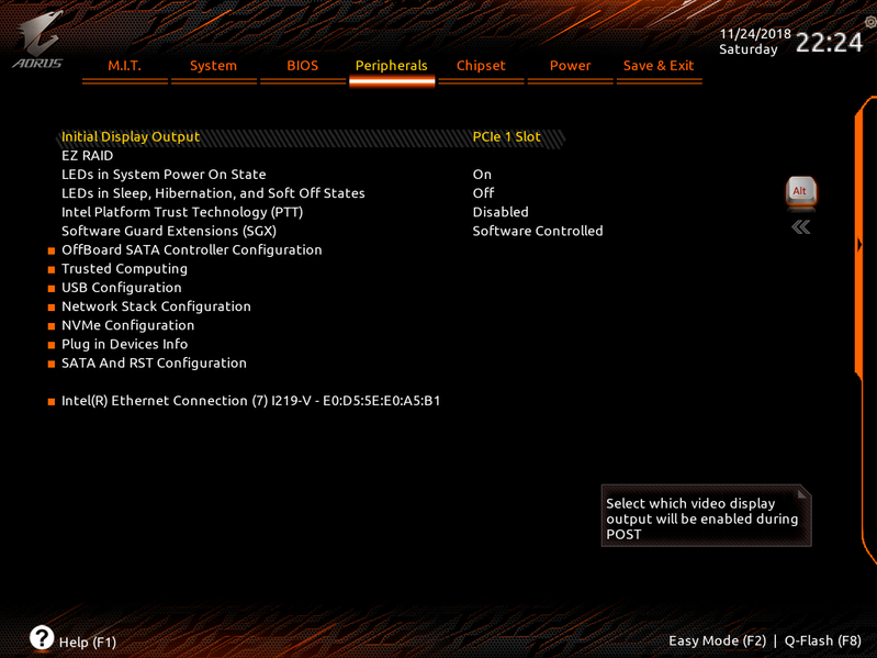 Переключение в классический режим BIOS происходит при нажатии на F2 и здесь уже доступны семь основных разделов с вложенными в них подразделами. Сразу же обращает на себя внимание несколько иное цветовое оформление оболочки, чем в платах Gigabyte Aorus предыдущей серии. Дополнительно появилось большее количество подсказок, а звездочками помечены пункты, добавляемые в подраздел «Избранное» (или наиболее часто используемые).