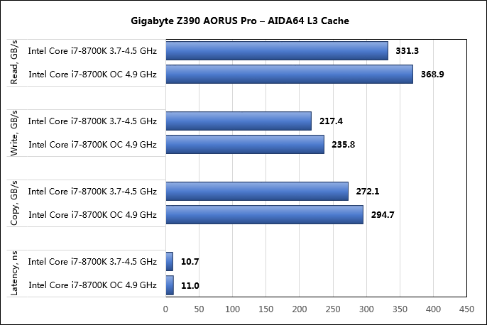 Никаких неприятных сюрпризов плата Gigabyte Z390 Aorus Pro не преподнесла, обеспечив стабильную работу процессора на частотах от 3700 до 4500 МГц при напряжении от 0,696 до 1,260 В.