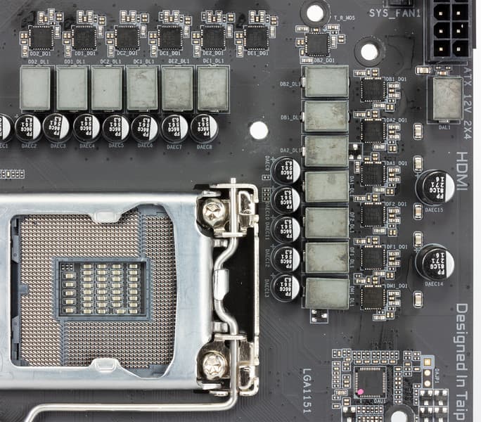 Поскольку процессорный разъем LGA1151-v2 здесь не имеет какой-то оптимизации или фирменных особенностей, поддерживая все выпускаемые в данном конструктивном исполнении процессоры, то сразу посмотрим на силовые цепи.
