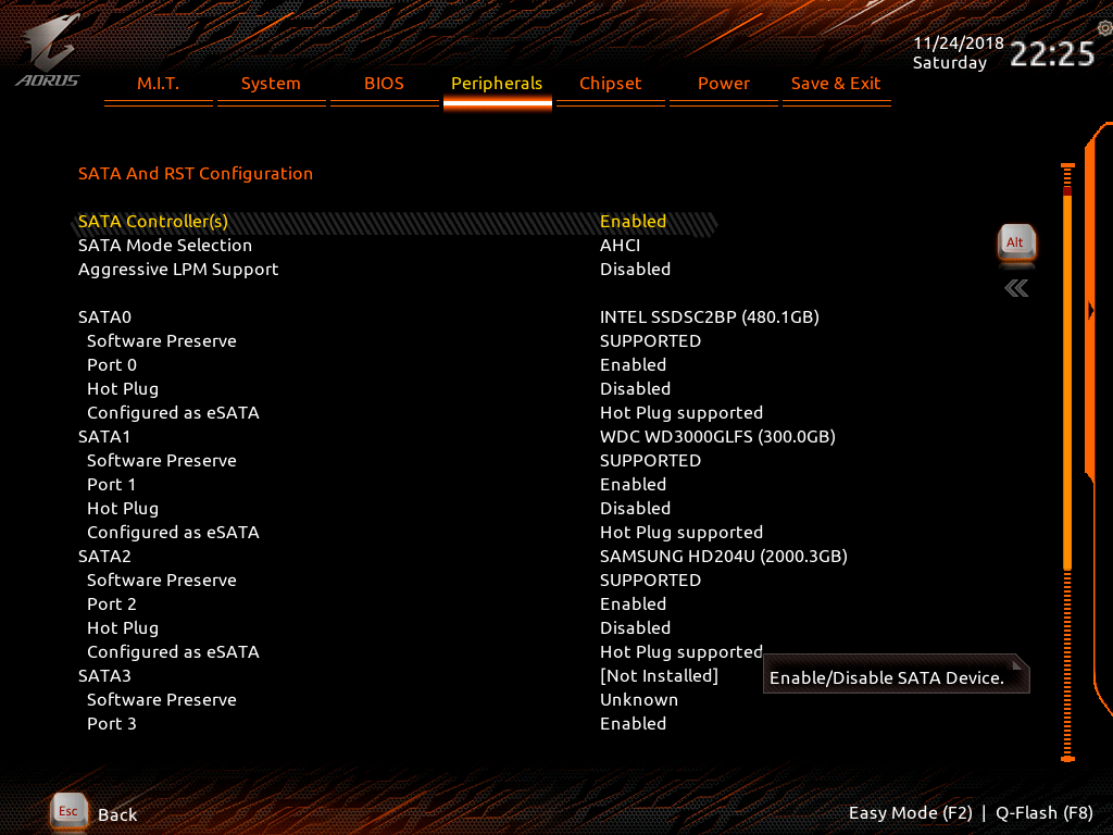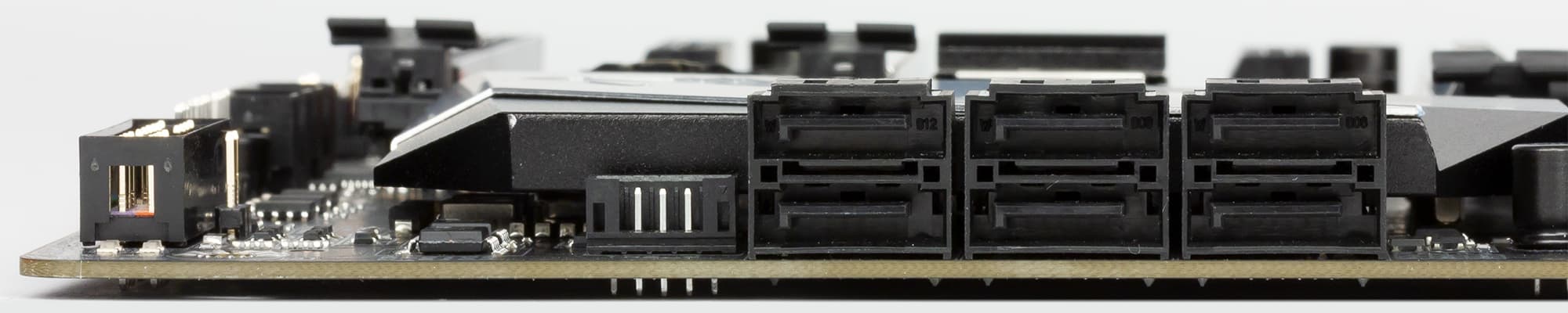 Все шесть портов SATA600 с пропускной способностью до 6 Гбит/с на плате реализованы возможностями чипсета и расположены в горизонтальной ориентации.