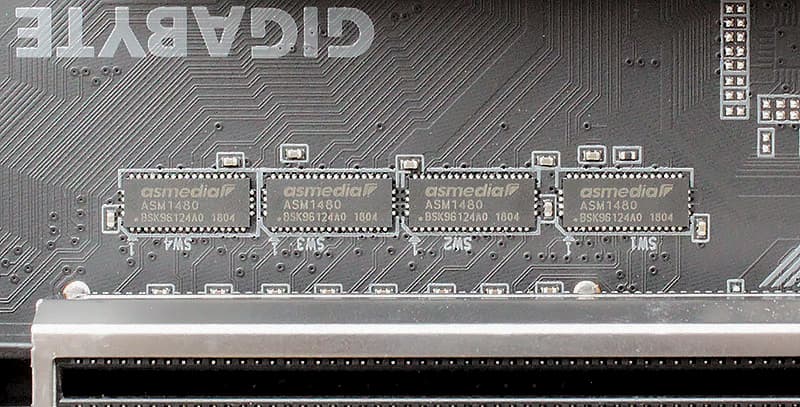За коммутацию линий PCI Express на Gigabyte Z390 Aorus Pro отвечают четыре микросхемы-мультиплексора ASM1480 производства ASMedia.
