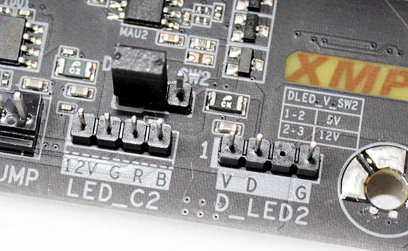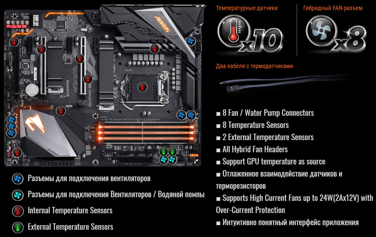 Кроме встроенной подсветки, к плате можно подключить две адресуемые и две не адресуемые светодиодные ленты, длина каждой из которых может достигать двух метров. Управление подсветкой и синхронизация подсветки RGB-лент осуществляется через фирменное приложение Gigabyte RGB Fusion.
