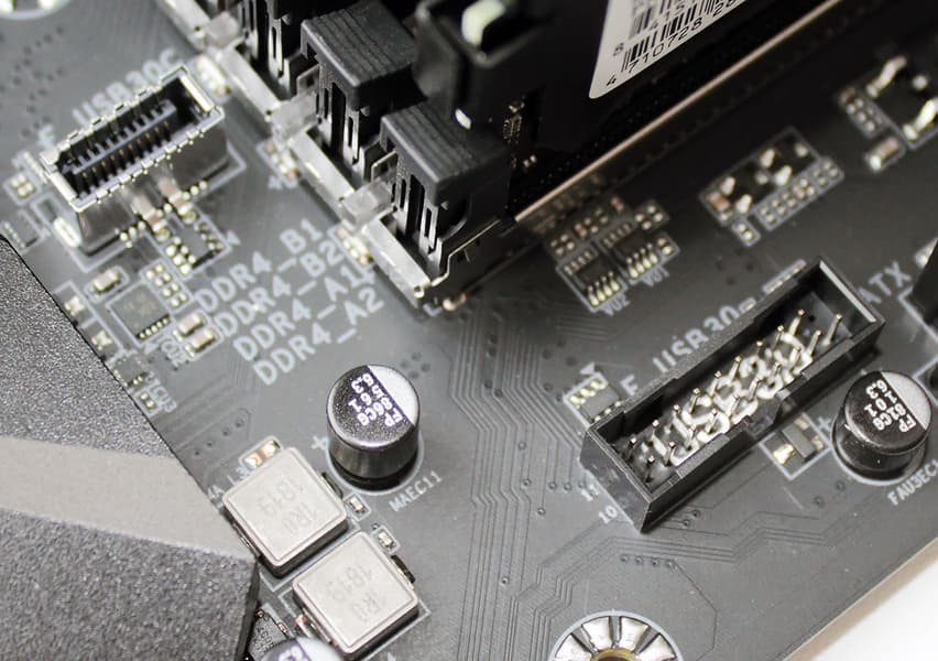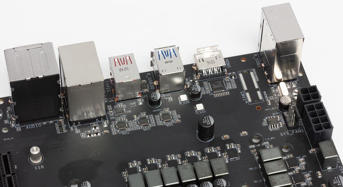 Также обращают на себя внимание яркие конденсаторы аудиокодека и ребристые по краям радиаторы накопителей в портах M.2.