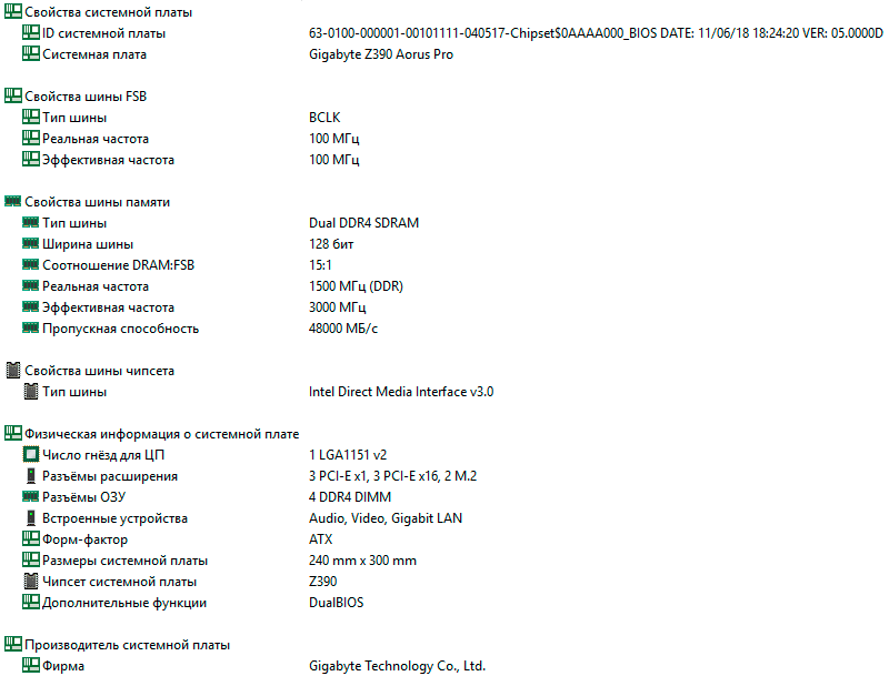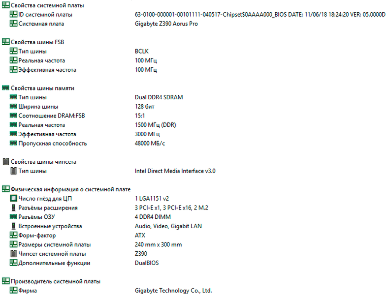 Характеристики платы Gigabyte Z390 Aorus Pro мы приведем из утилиты AIDA64 Extreme.