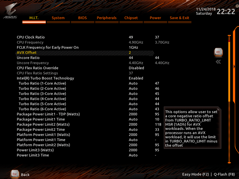 Проваливаясь глубже в подраздел дополнительных настроек процессора, можно увидеть огромное количество доступных к изменению параметров, включая занижение множителя при выполнении AVX-инструкций и настройку множителя для каждого ядра процессора, что будет полезно при изучении предела его оверклокерских возможностей.