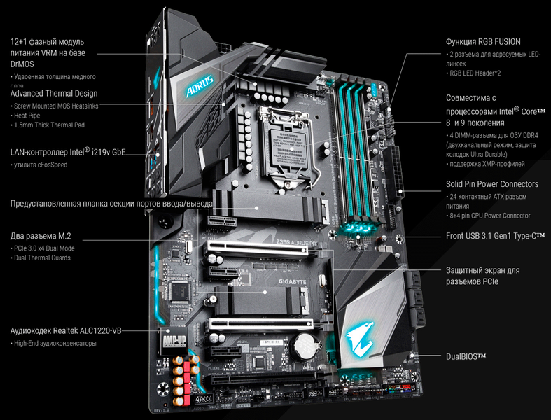 Большинство достоинств новой Gigabyte Z390 Aorus Pro приведены на картинке ниже. Среди них отметим усиленную систему питания процессора с переработанным охлаждением, дополнительно оптимизированный аудиокодек, металлизированные оболочки двух слотов PCI Express, двойной BIOS и равномерно распределенную по текстолиту подсветку.