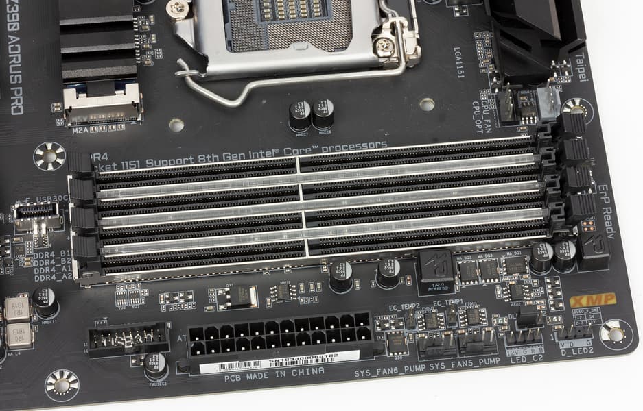 Несмотря на тот факт, что Z390 Aorus Pro не относится к флагманским моделям Gigabyte на этом наборе системной логики, все ее слоты DIMM оперативной памяти получили металлизированную оболочку Ultra Durable Memory Armor, которая не только усиливает сами разъемы, но и защищает контакты в них от электромагнитных помех.