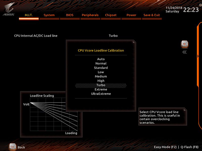 Для процессора здесь предусмотрены сразу же восемь уровней стабилизации напряжения (LLC). Удобно, что при выборе каждого из них, на простеньком графике показывается, в какой степени напряжение будет стабилизировано.