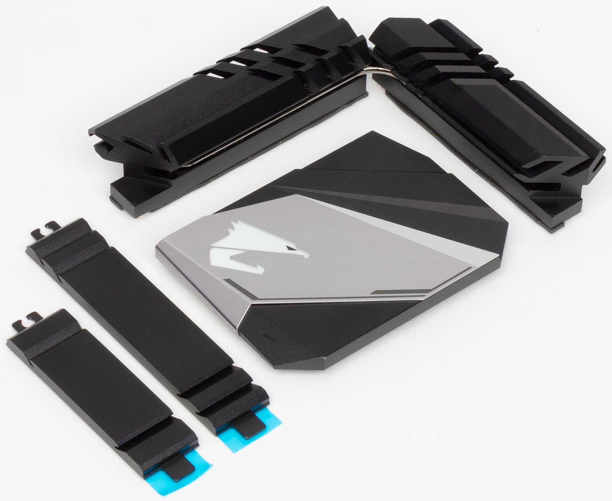 В комплект поставки Gigabyte Z390 Aorus Pro входят инструкция по эксплуатации, два кабеля с термодатчиками, DVD с драйверами и утилитами, четыре SATA-кабеля с защелками, наклейка Aorus, колодка для удобного подключения кабелей передней панели корпуса, два кабеля для лент RGB-подсветки и винты для крепления накопителей в портах M.2.