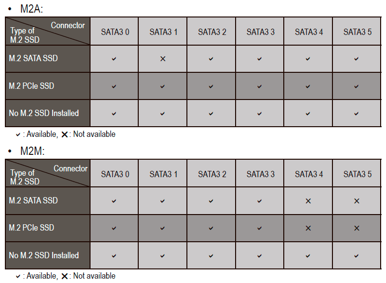 Оба порта поддерживают как SATA-, так и PCIe-накопители, но в верхний можно установить модули длиной от 42 до 110 мм, а в нижний — длиной от 42 до 80 мм. Отметим, что для накопителей в обоих портах предусмотрены массивные радиаторы, что ранее было редкостью для плат данного ценового сегмента. Ограничения по одновременному использованию подключенных к плате накопителей приведены в таблице.