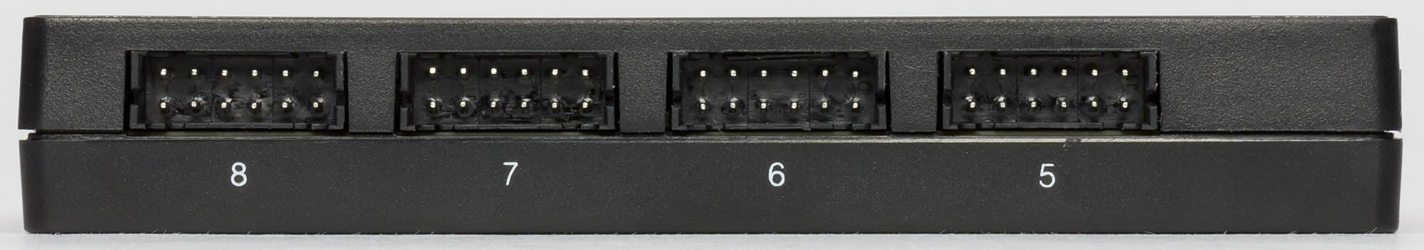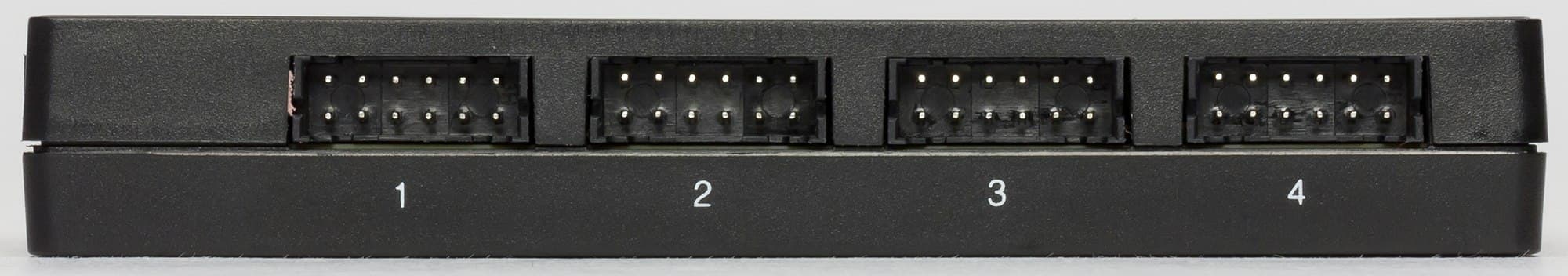 Разъемы для подключения адресуемых (5 B 3 A, до 15 Вт) и неадресуемых (12 В 3 А, до 36 Вт) RGB-лент/устройств разнесены попарно на противоположные стороны платы. Сверху: