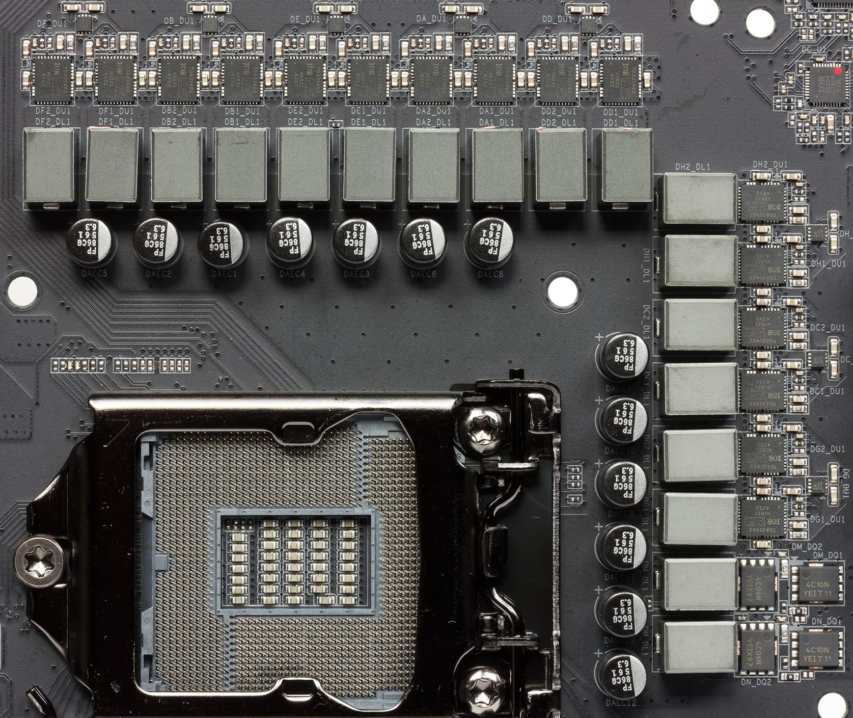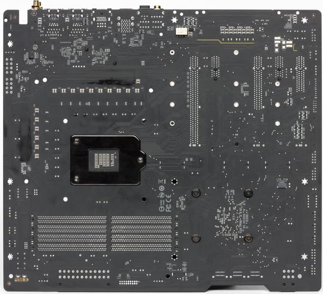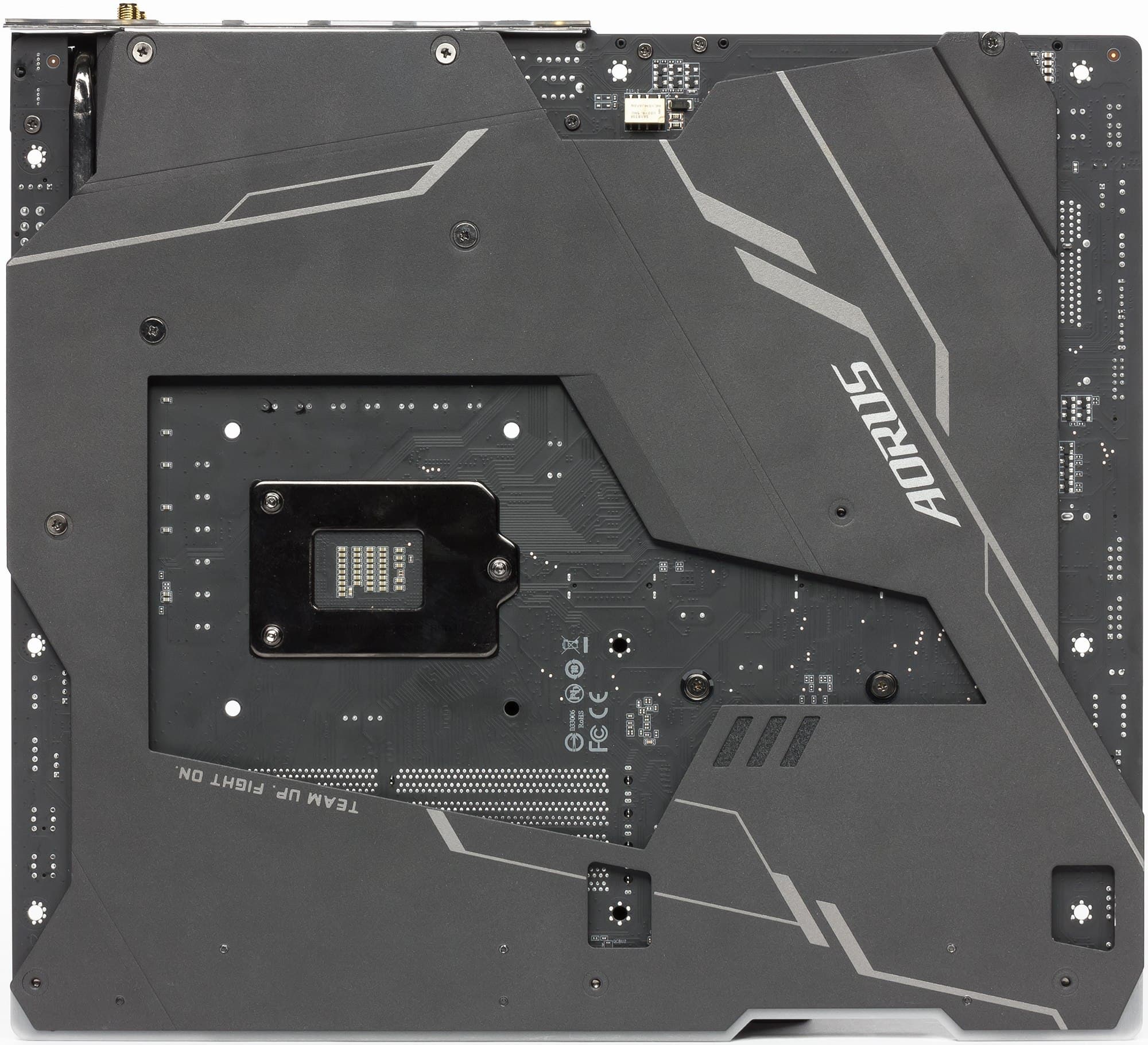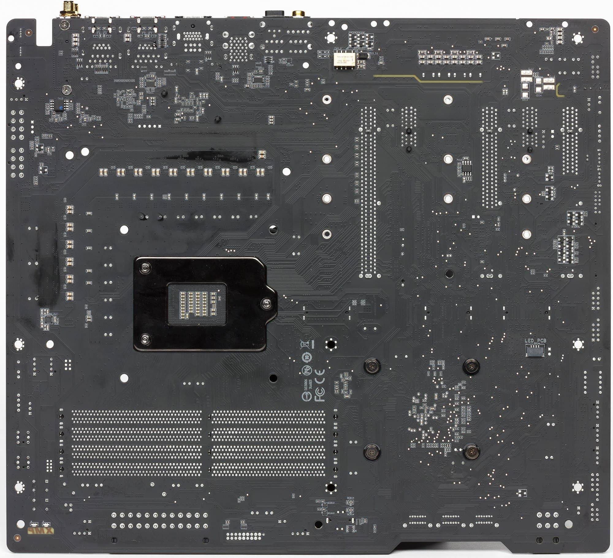 C оборотной стороны имеется пластина из алюминия с нанокарбоновым покрытием для предотвращения замыкания электроконтактов на PCB. Также пластина помогает отводить тепло от задней стороны PCB через термоинтерфейс и обеспечивает жесткость материнской платы. Однако, как выяснилось, эта пластина может мешать монтажу платы в некоторые корпуса. Обратите внимание на нижний левый угол. Крепежное отверстие находится очень близко от края защитной пластины, и это не дает плате ровно «лечь» в том случае, если в корпусе используются выпресованные возвышения (они имеют большую ширину), а не всем хорошо известные латунные вставки для установки на них материнских плат.