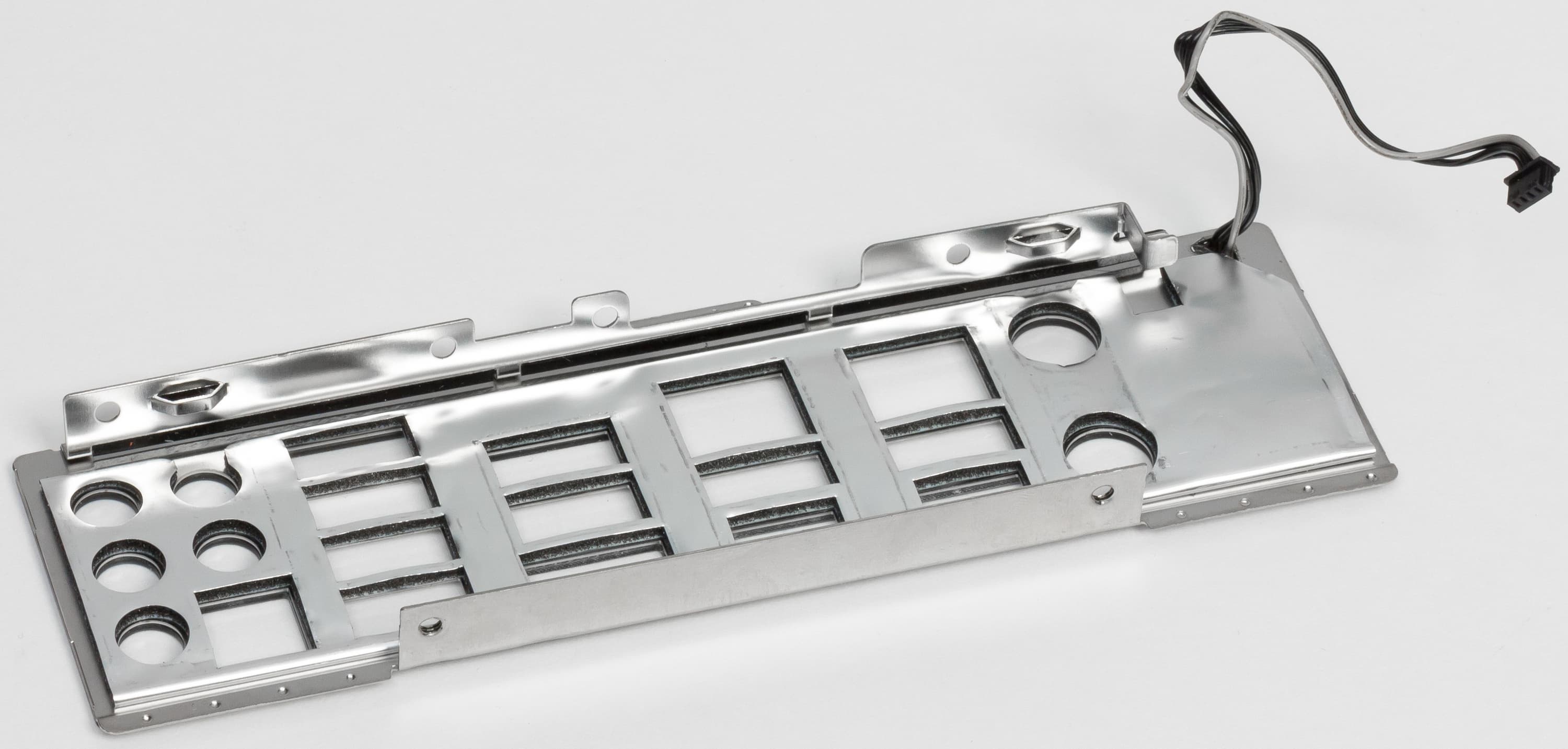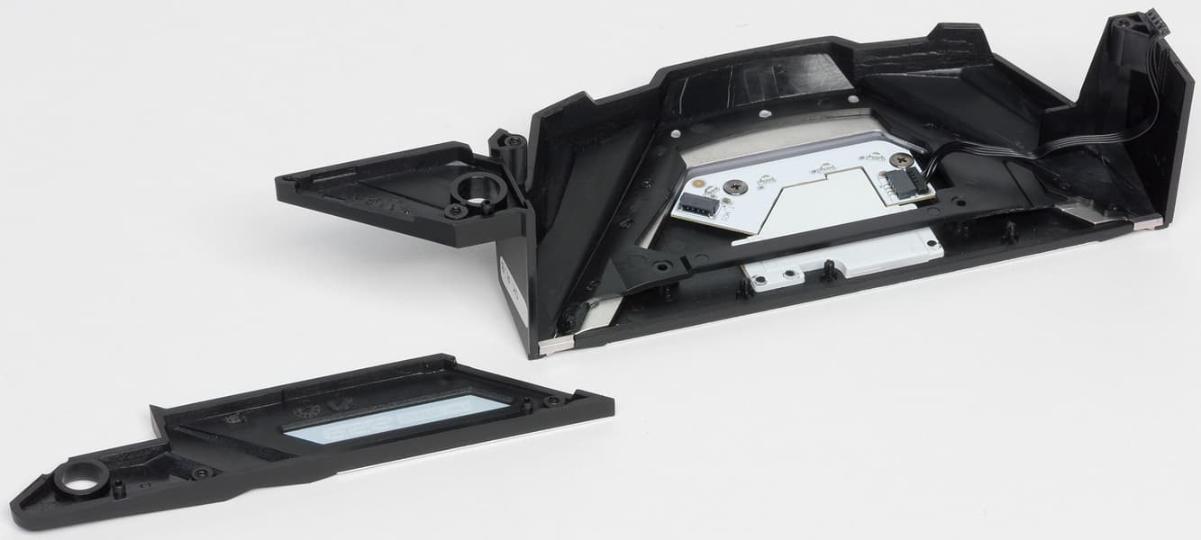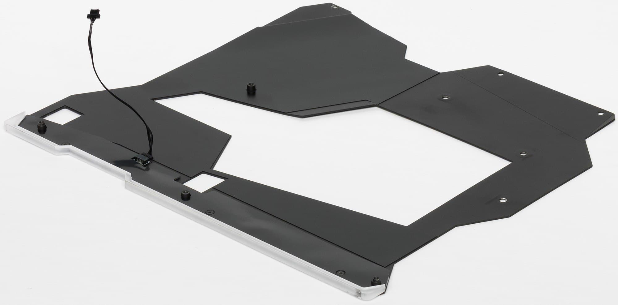 C оборотной стороны имеется пластина из алюминия с нанокарбоновым покрытием для предотвращения замыкания электроконтактов на PCB. Также пластина помогает отводить тепло от задней стороны PCB через термоинтерфейс и обеспечивает жесткость материнской платы. Однако, как выяснилось, эта пластина может мешать монтажу платы в некоторые корпуса. Обратите внимание на нижний левый угол. Крепежное отверстие находится очень близко от края защитной пластины, и это не дает плате ровно «лечь» в том случае, если в корпусе используются выпресованные возвышения (они имеют большую ширину), а не всем хорошо известные латунные вставки для установки на них материнских плат.