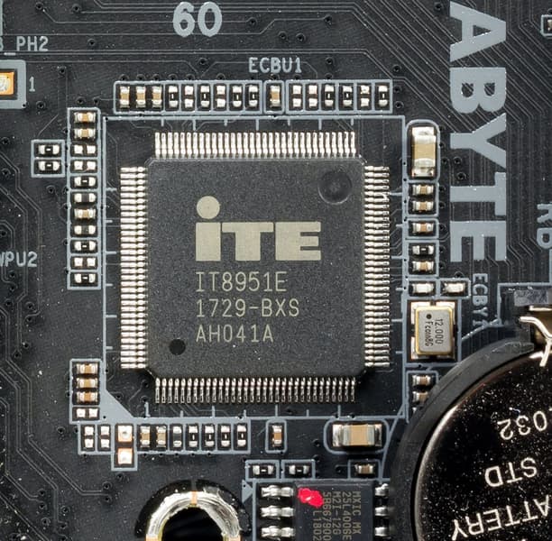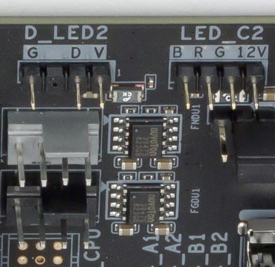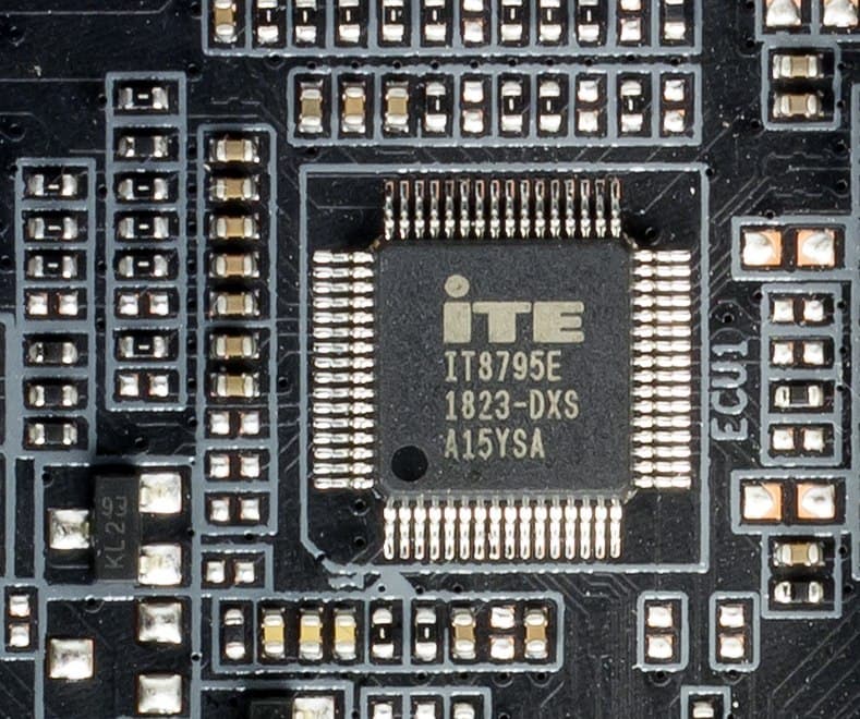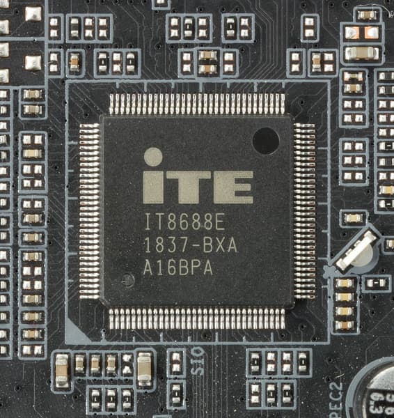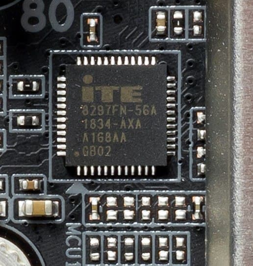 Если уж мы заговорили о световых индикаторах, то надо упомянуть и возможности материнской платы по подключению RGB-подсветки. За нее отвечает контроллер ITE 8297FN.