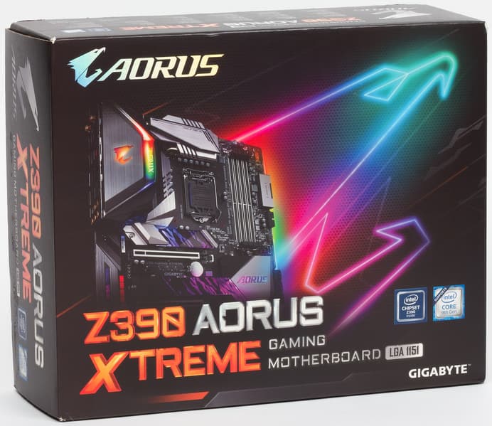 Gigabyte Z390 Aorus Xtreme поставляется в большой и толстой красочной коробке. Фирменный «сокол» (логотип бренда Aorus) переливается всеми цветами радуги, это явный намек на богатую RGB-подсветку :)