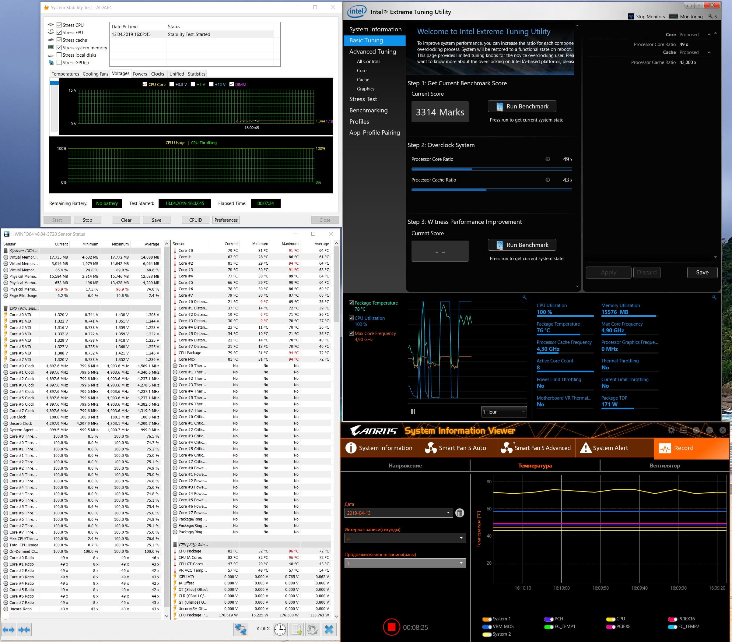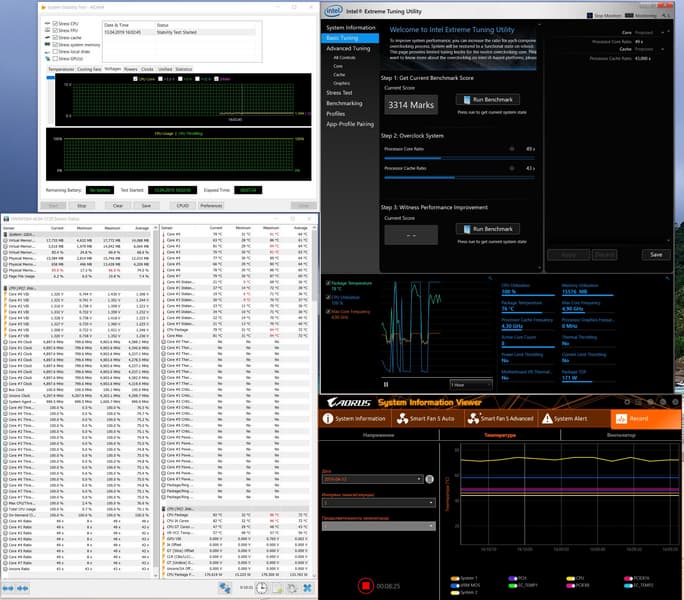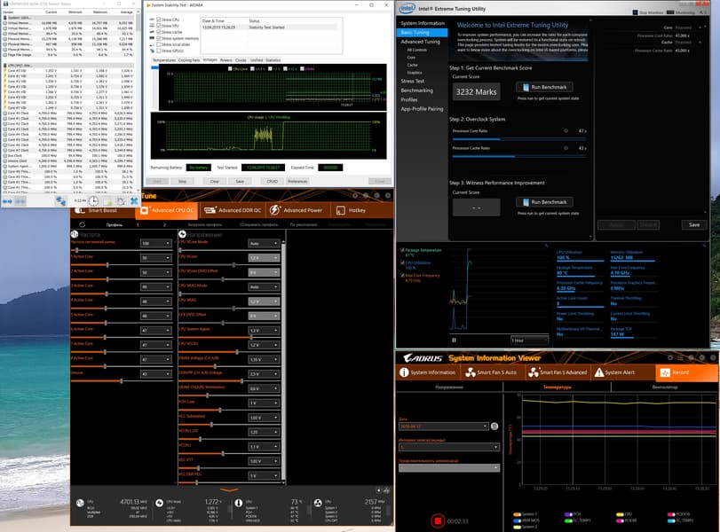 А дальше... Все зависит от экземпляра процессора и возможностей СО. Мы видим, что материнская плата свою работу провела прекрасно, давая все возможности по получению нужных частот и иных параметров. Тут уж.. кому как повезет, не зря же «одаренные» экземпляры процессоров 9900К ценятся очень высоко, и в компаниях их дают на тесты под строгим надзором, а если таковые попадаются обозревателям, то за пределы их тестлабов такие экземпляры уже не выходят.