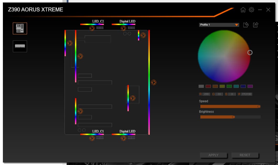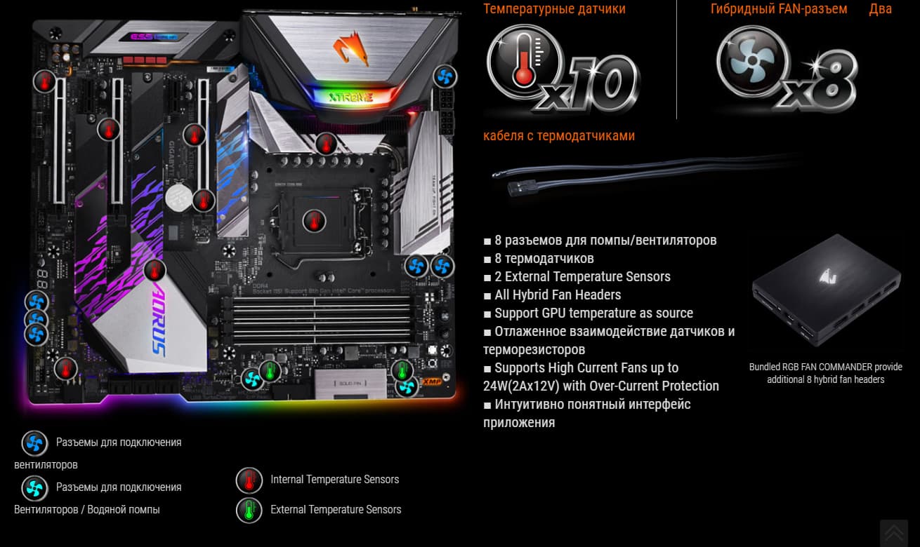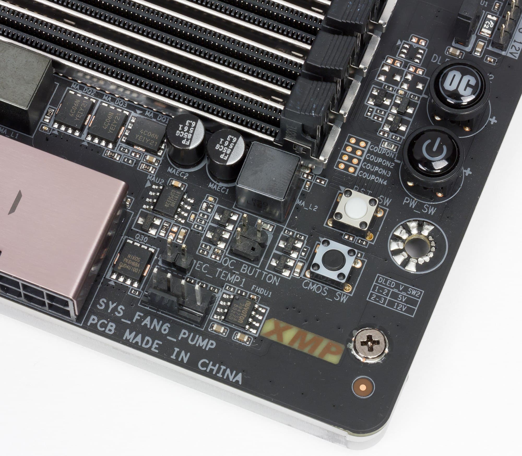 | Прочие внутренние элементы | 24-контактный разъем питания ATX 2 8-контактных разъема питания ATX12V 6-контактный разъем питания PCI-E для подпитки видеокарт 1 слот M.2 (E-key), занят адаптером беспроводных сетей 1 разъем для подключения порта USB 3.1 Type-C 1 разъем для подключения 2 портов USB 3.0 2 разъема для подключения 4 портов USB 2.0 8 разъемов для подключения 4-контактных вентиляторов (поддержка помп ЖСО) 2 разъема температурных сенсоров 2 разъема для подключения адресуемой RGB-ленты 2 разъема для подключения неадресуемой RGB-ленты 1 разъем аудио для передней панели корпуса 1 разъем TPM (Trusted Platform Module) 1 кнопка включения питания (Power) 1 кнопка перезагрузки (Reset) 1 кнопка режима разгона (OC) 1 кнопка сброса CMOS 2 переключателя BIOS 1 перемычка очистки CMOS 1 разъем для подключения карты разгона GC-OC Touch |