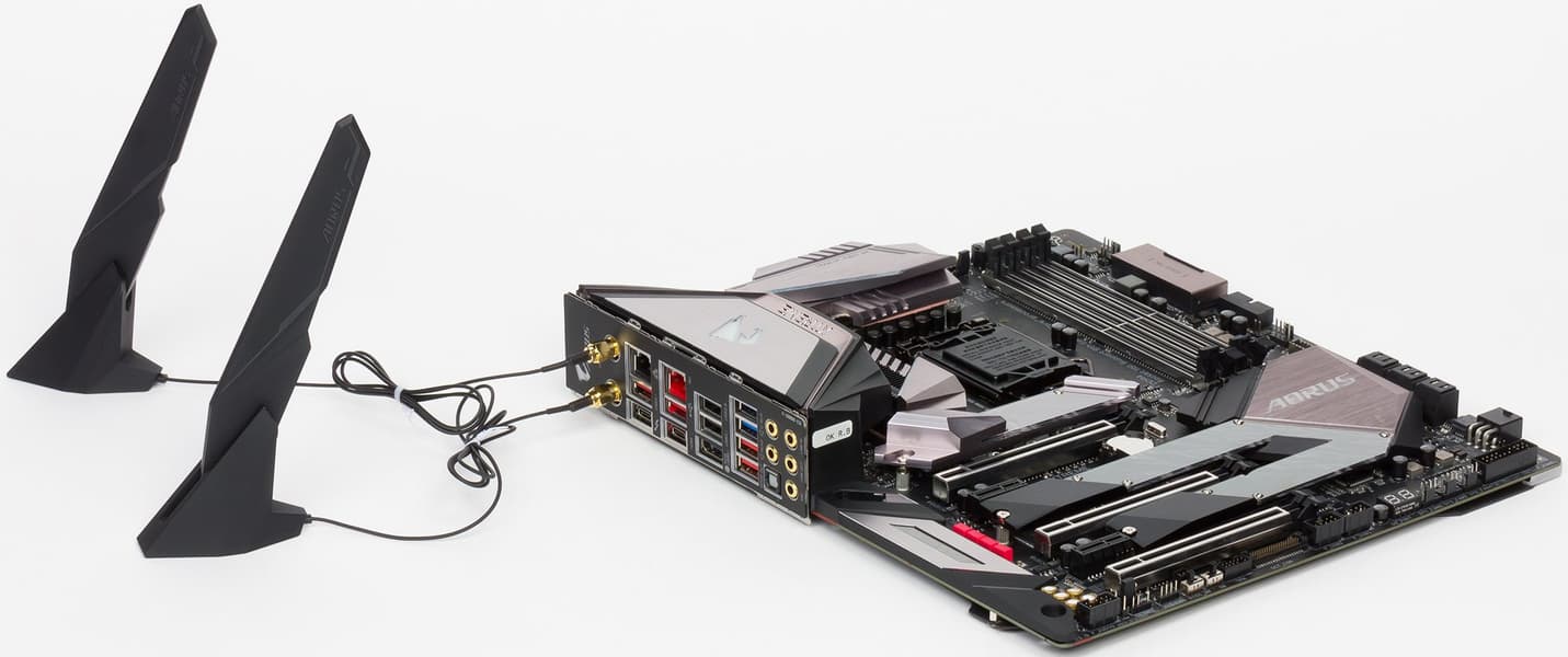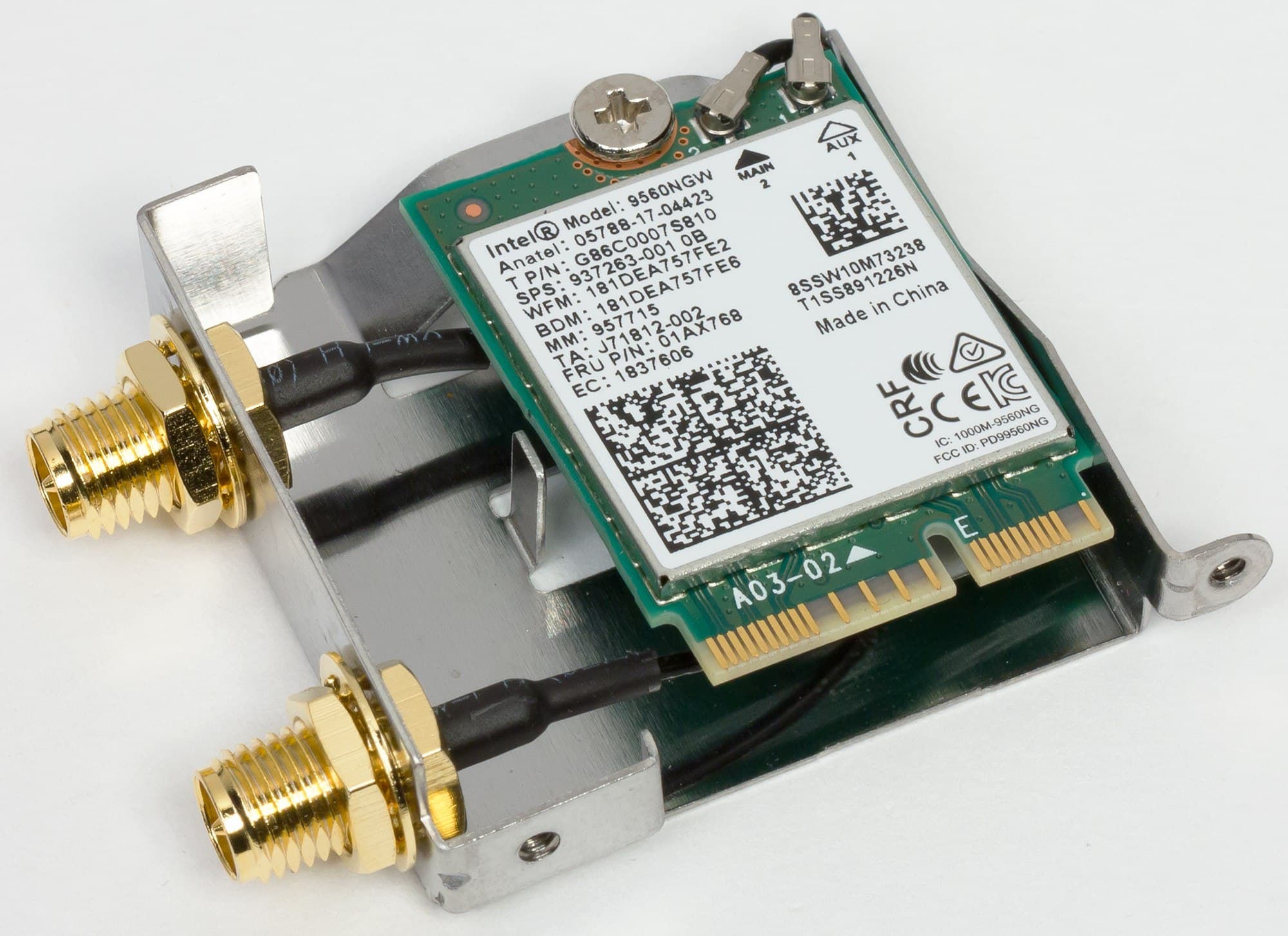 Беспроводные адаптеры Wi-Fi 802.11a/b/g/n/ac и Bluetooth 5.0 реализованы на контроллере Intel AC-9560. Он установлен в слот M.2 (E-key), и его разъемы для привинчивания выносных антенн выведены на заднюю панель.