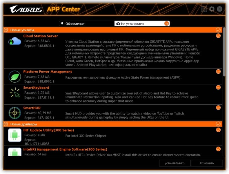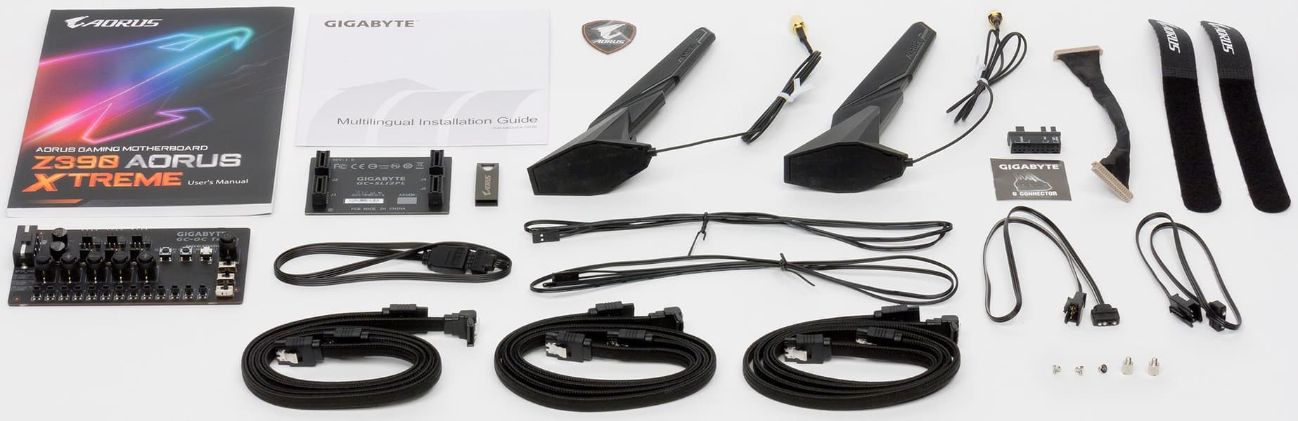 Фирменное ПО поставляется на флеш-накопителе (наконец-то не на CD). Впрочем программное обеспечение за время путешествия платы к покупателю все равно успевает устареть, так что придется его обновлять с сайта производителя сразу после покупки. Также в комплекте можно найти традиционные SATA-кабели, винтики для крепления M.2-накопителей, выносные антенны для беспроводного сетевого адаптера, фирменные стяжки и G-connector (для удобного подключения индикаторов и кнопок на корпусе к материнской плате). При этом «заглушка» на заднюю панель с разъемами уже смонтирована на самой плате.