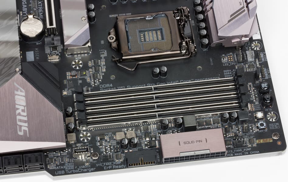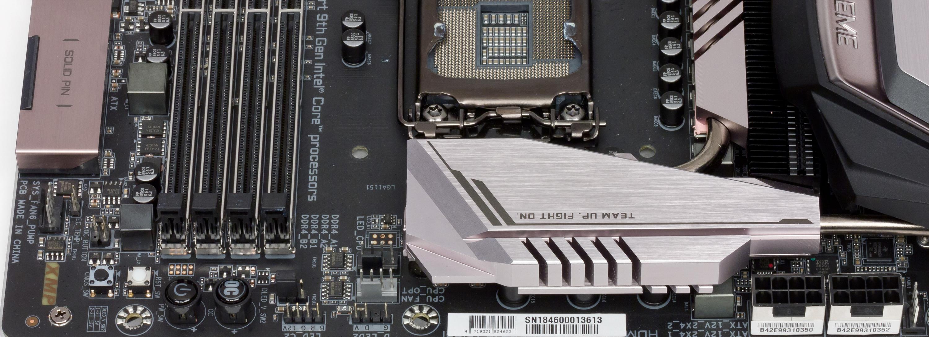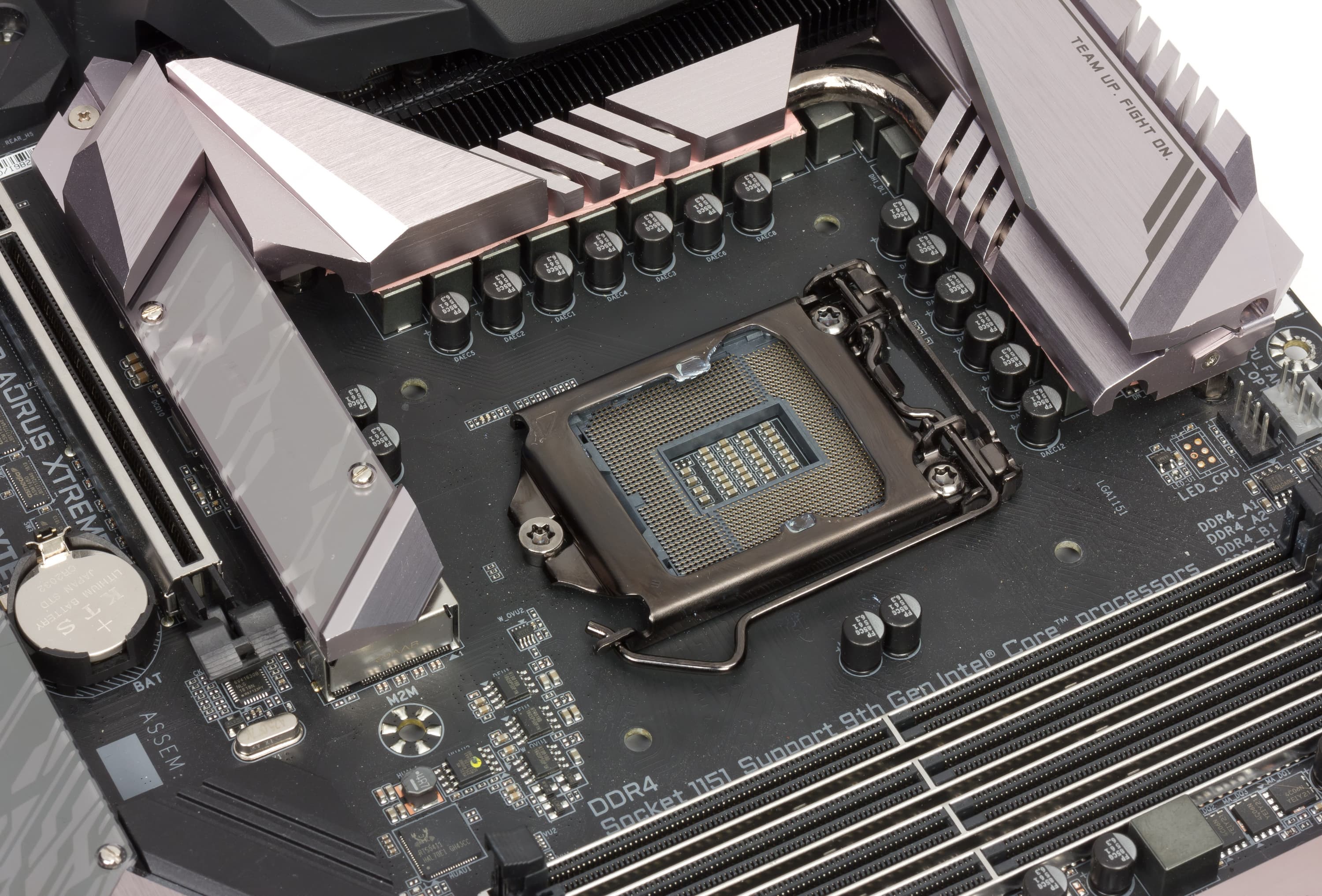 Напоминаю, что Gigabyte Z390 Aorus Xtreme поддерживает процессоры Intel Core 8-го и 9-го поколений, выполненные под разъем (сокет) LGA1151v2. Хотя физически отличий от старого LGA1151 нет, старые процессоры в LGA1151 v2 работать не будут. Поэтому еще раз напомню: только модели с индексами 8000 и 9000!